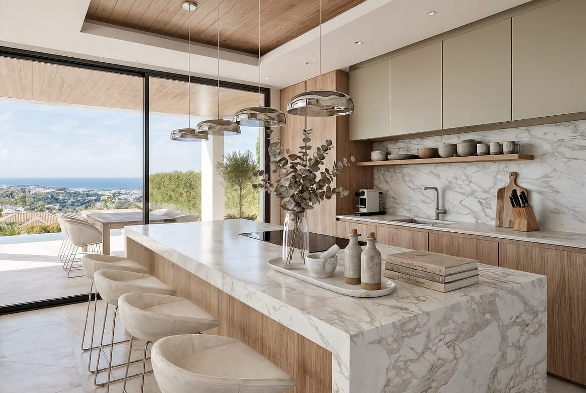 From its elevated position, the villa enjoys breathtaking panoramic views of the Mediterranean Sea, the golf course and the surrounding natural landscape. Its orientation and architectural design have been carefully conceived to maximise natural light and enhance the visual connection with the environment, creating spaces that convey calm, openness and exclusivity.