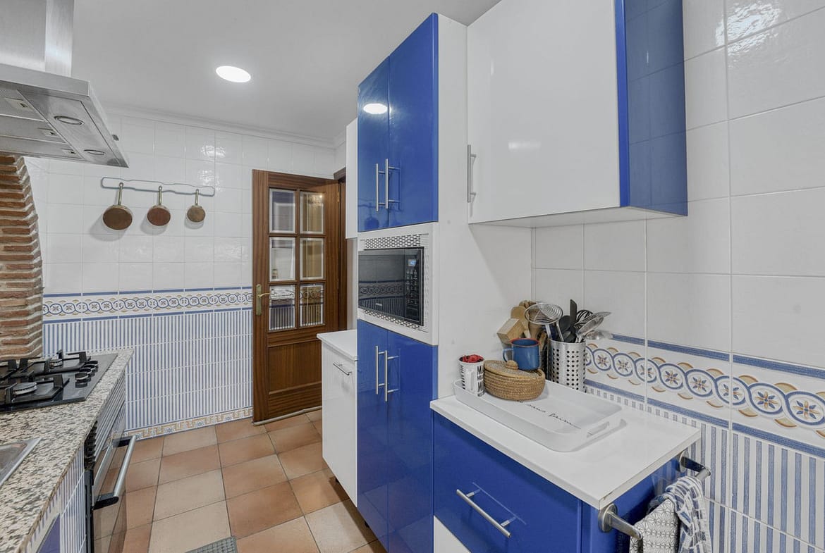 blue and white Formica furniture and Porcelanosa flooring, bathroom with Italian-style walk-in shower, living room fireplace with insert, PVC window shutters with motor, high-end appliances, etc.