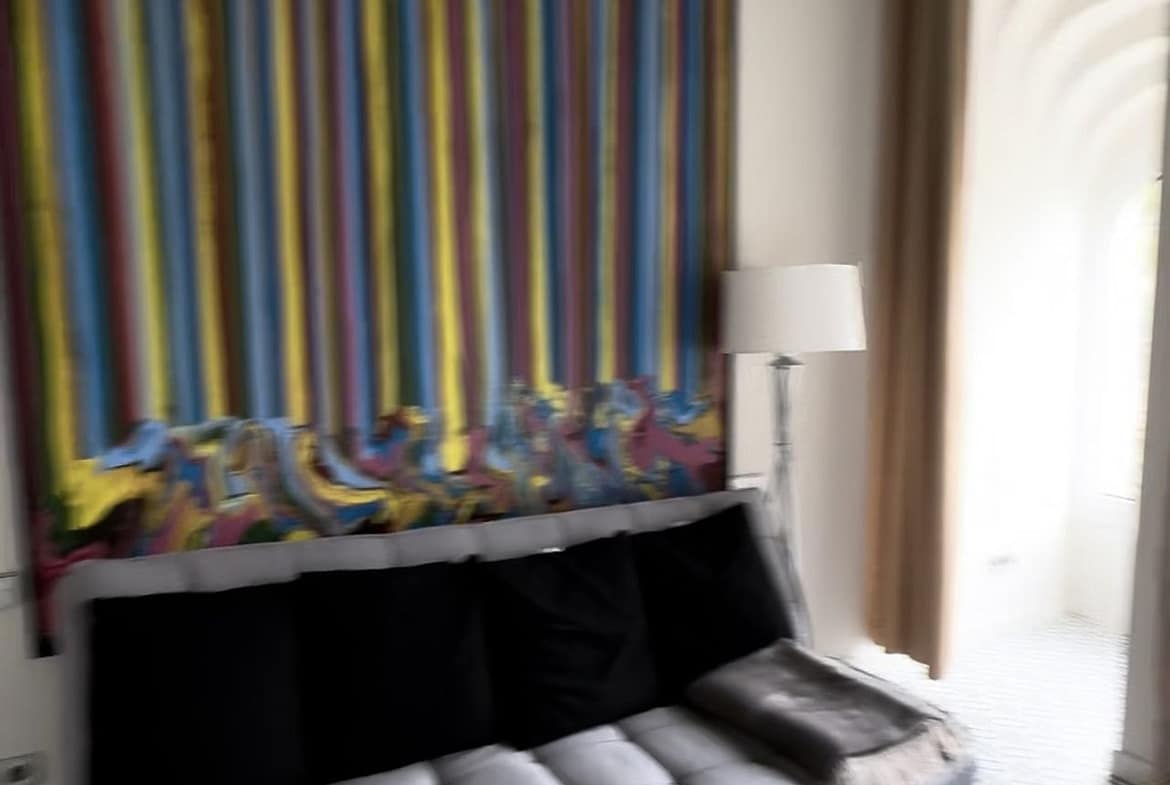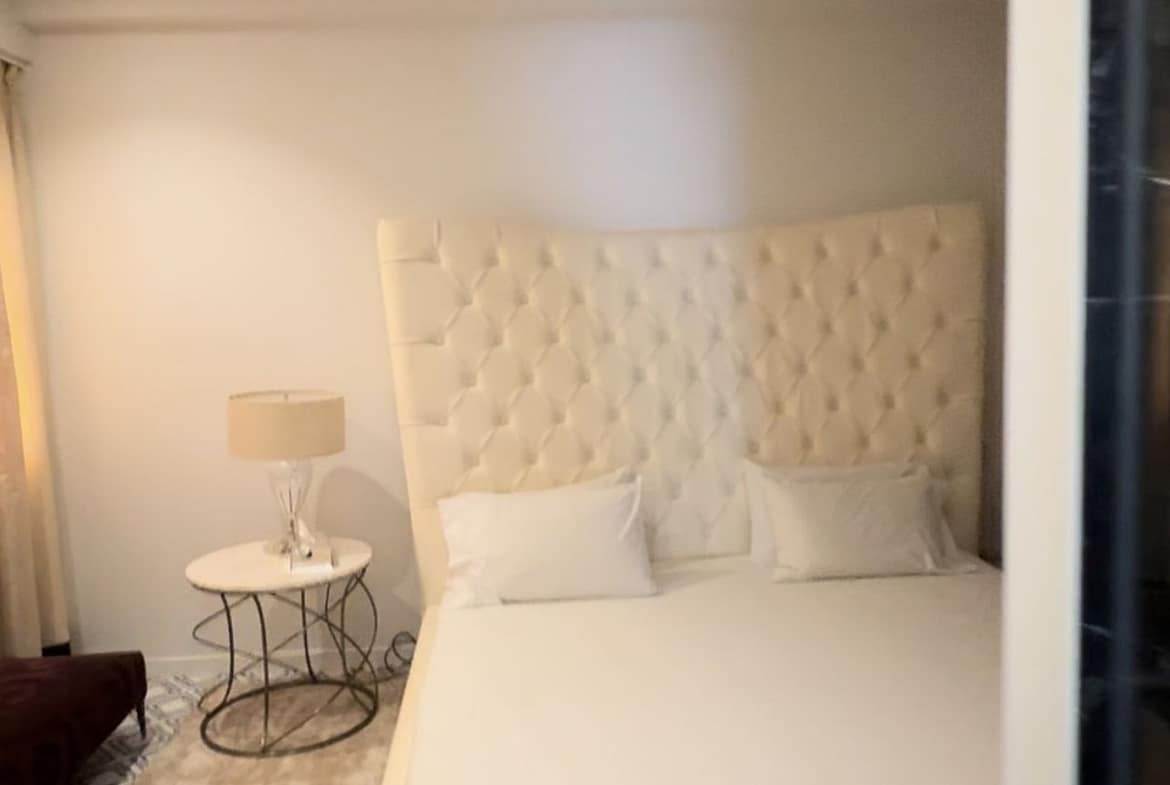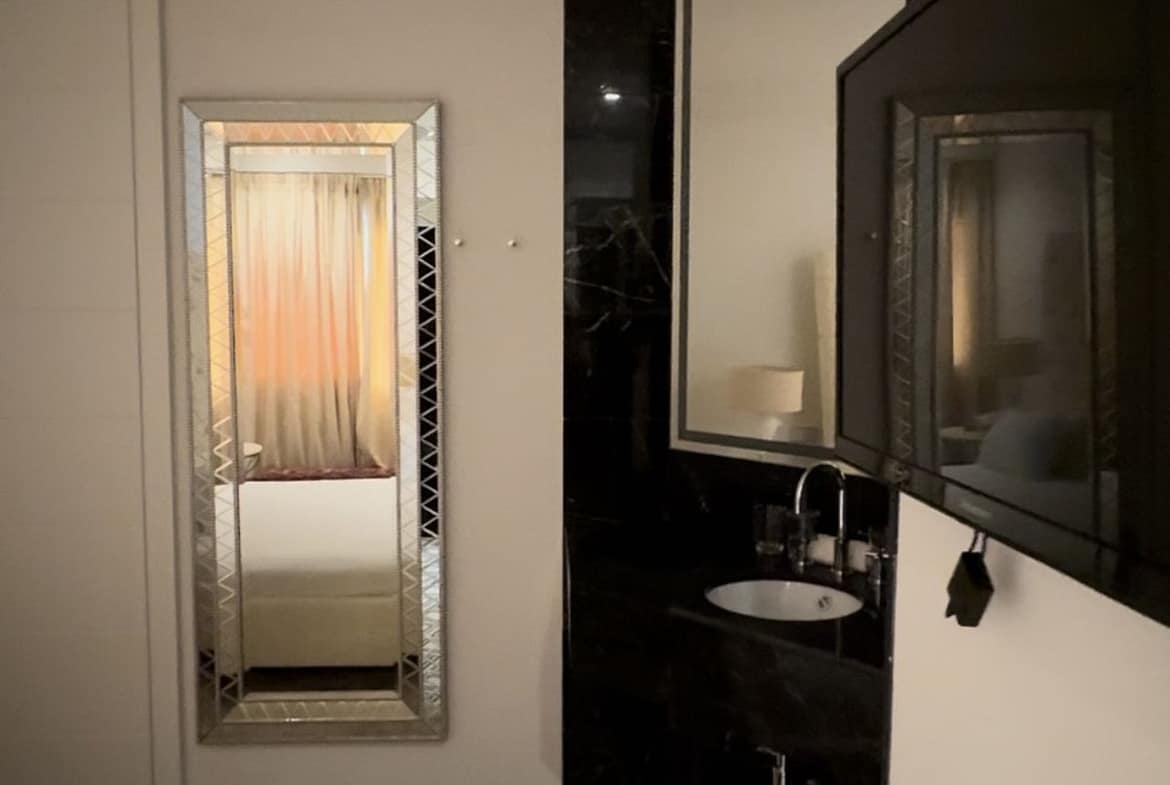 To the left of the elevator, you enter the second bedroom (BR2), designed in a unique layout featuring an elegant king-size bed, a separate shower and toilet, and an adjacent sink area, all adorned with beautiful silk curtains.