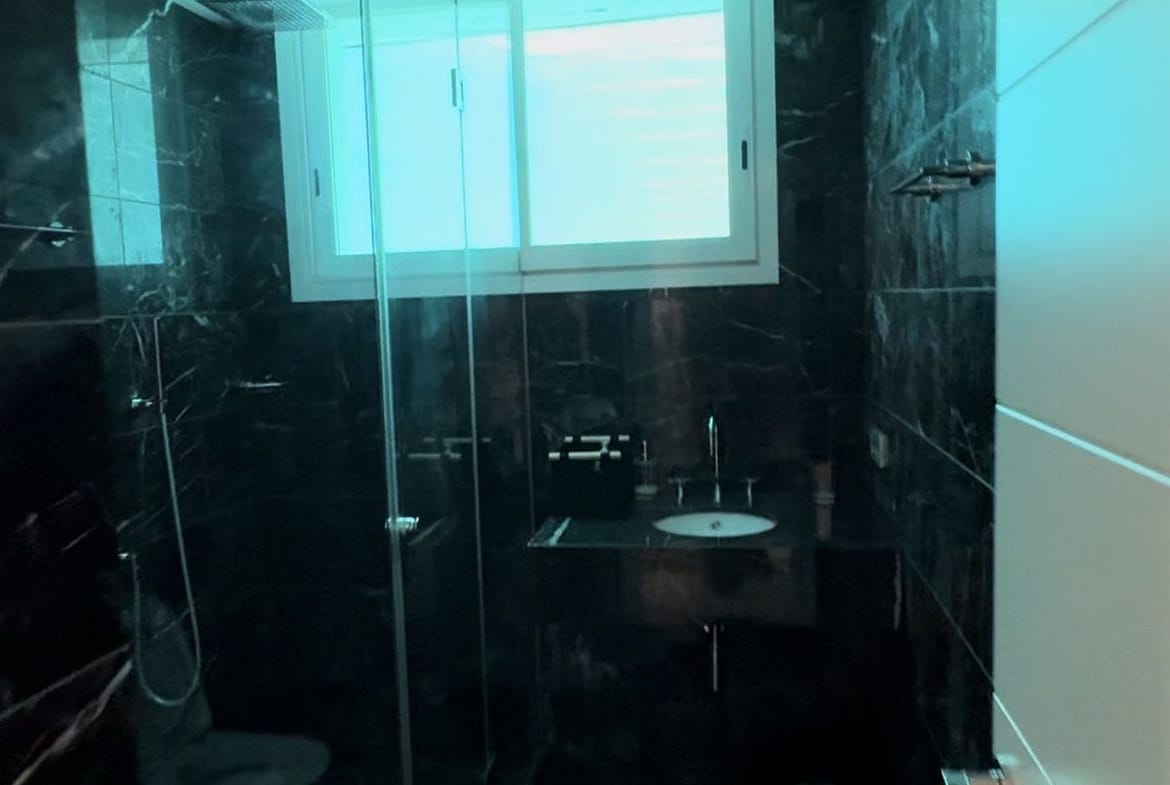 The spacious master bathroom, like all the bathrooms in the house, is adorned with luxurious black marble and includes a large double shower, a double sink, a toilet, and a bidet. There is a door from the bathroom that opens directly to the garden, providing outdoor access without needing to use the elevator. Each bathroom is filled with natural light thanks to well-placed windows.