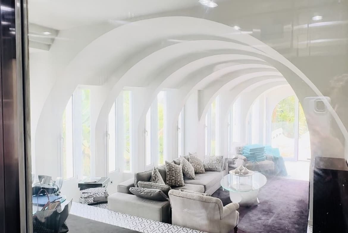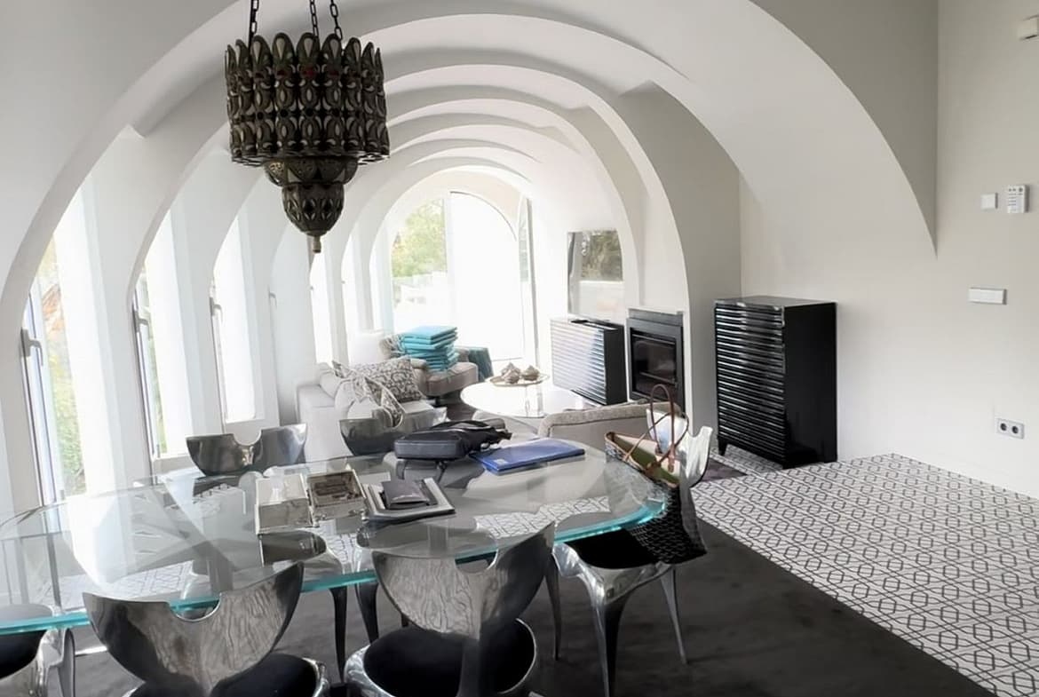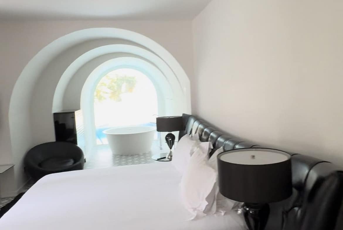 Taking the elevator down to the main floor, you’ll find the fabulous master bedroom, featuring an oversized king-size bed and a round open bathtub overlooking the pool and garden. The luxurious decor, elegant lighting, high-quality furnishings, and exquisite silk curtains give this space a touch of opulence.