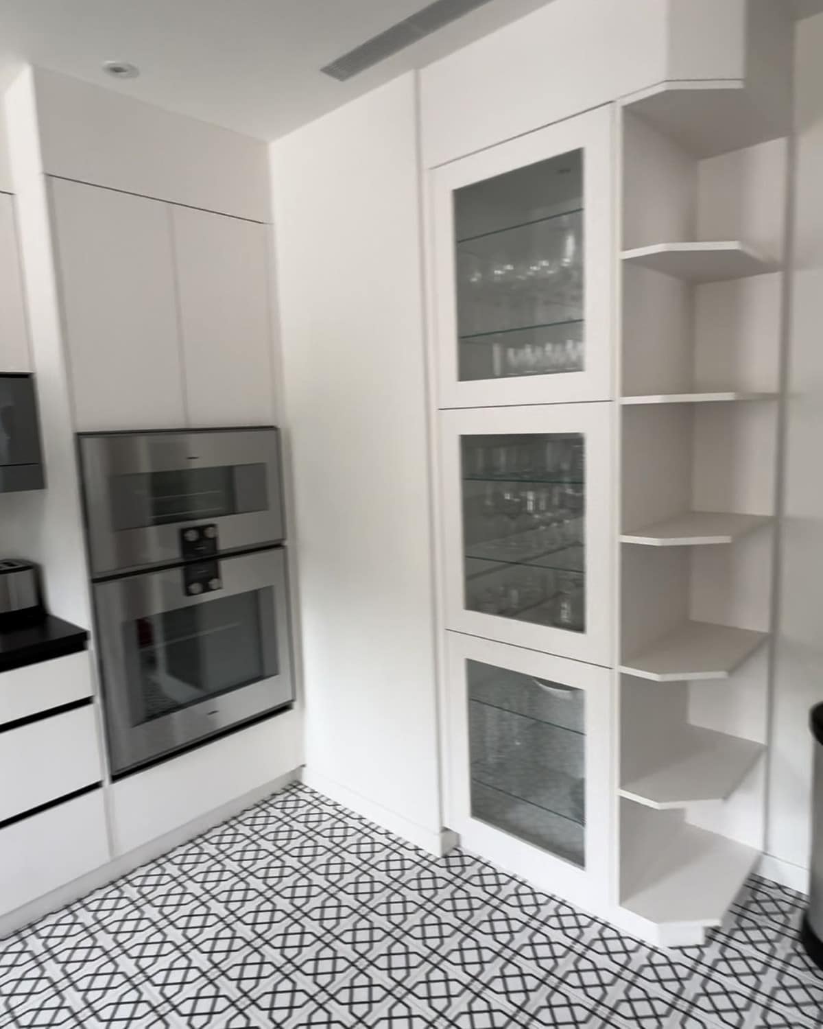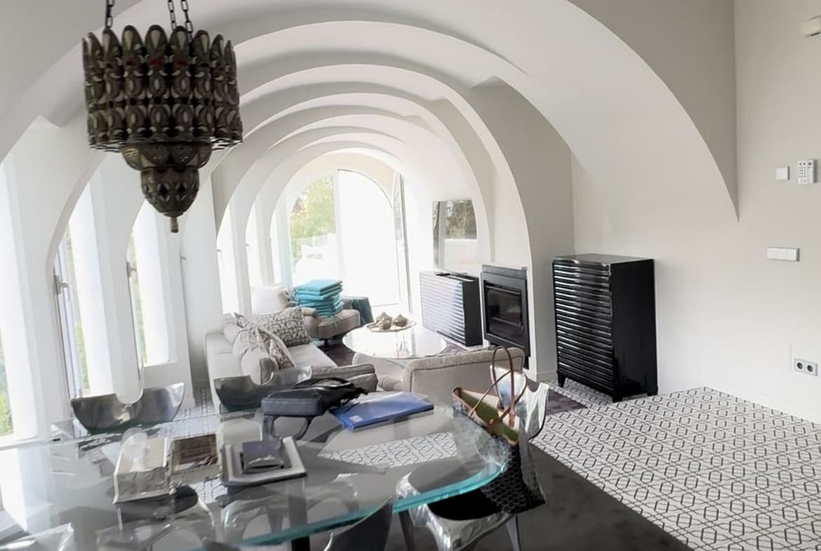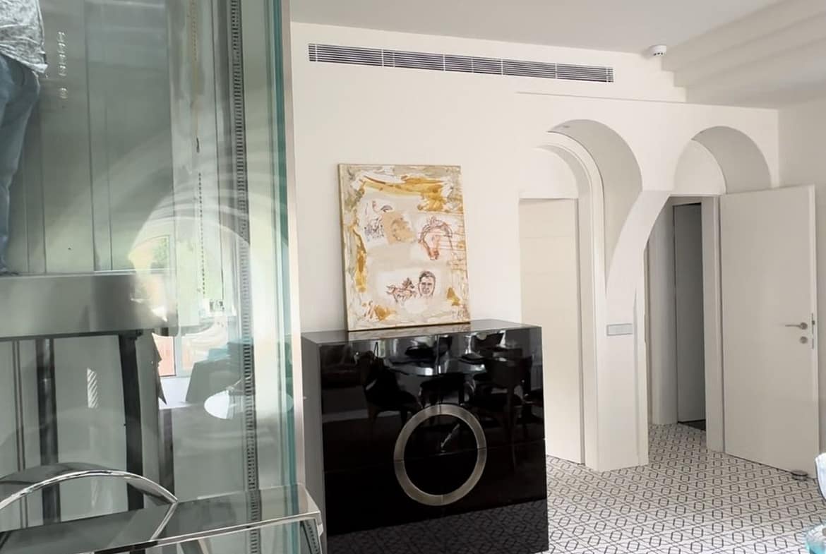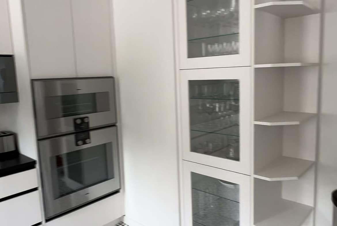 Spread over 4 levels, all connected via a state-of-the-art glass elevator, this home offers generous spaces and an optimized layout. The open-plan concept includes an entrance hall, a living room with a vaulted ceiling and an open fireplace, an elegant dining area, and a modern, fully-equipped Gaggenau kitchen with sleek black granite countertops.