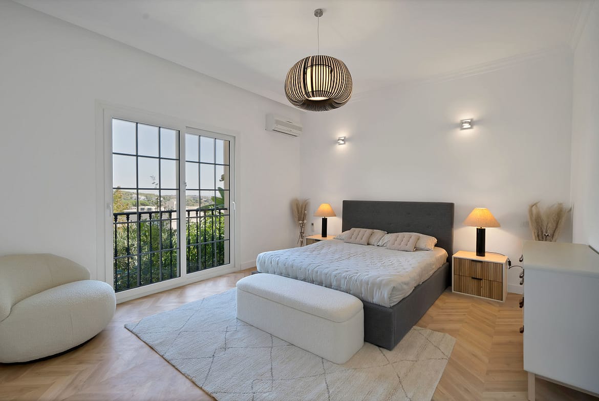 The house is distributed across two levels. On the main floor, a brand new open plan kitchen with top of the range appliances connects seamlessly to the living area with a travertine marble fireplace and dining space. Large glass doors open onto a sunny terrace with a barbecue area and a private plunge pool, ideal for outdoor entertaining. This level also offers a spacious en suite bedroom and a guest powder room.