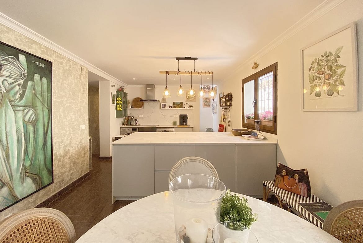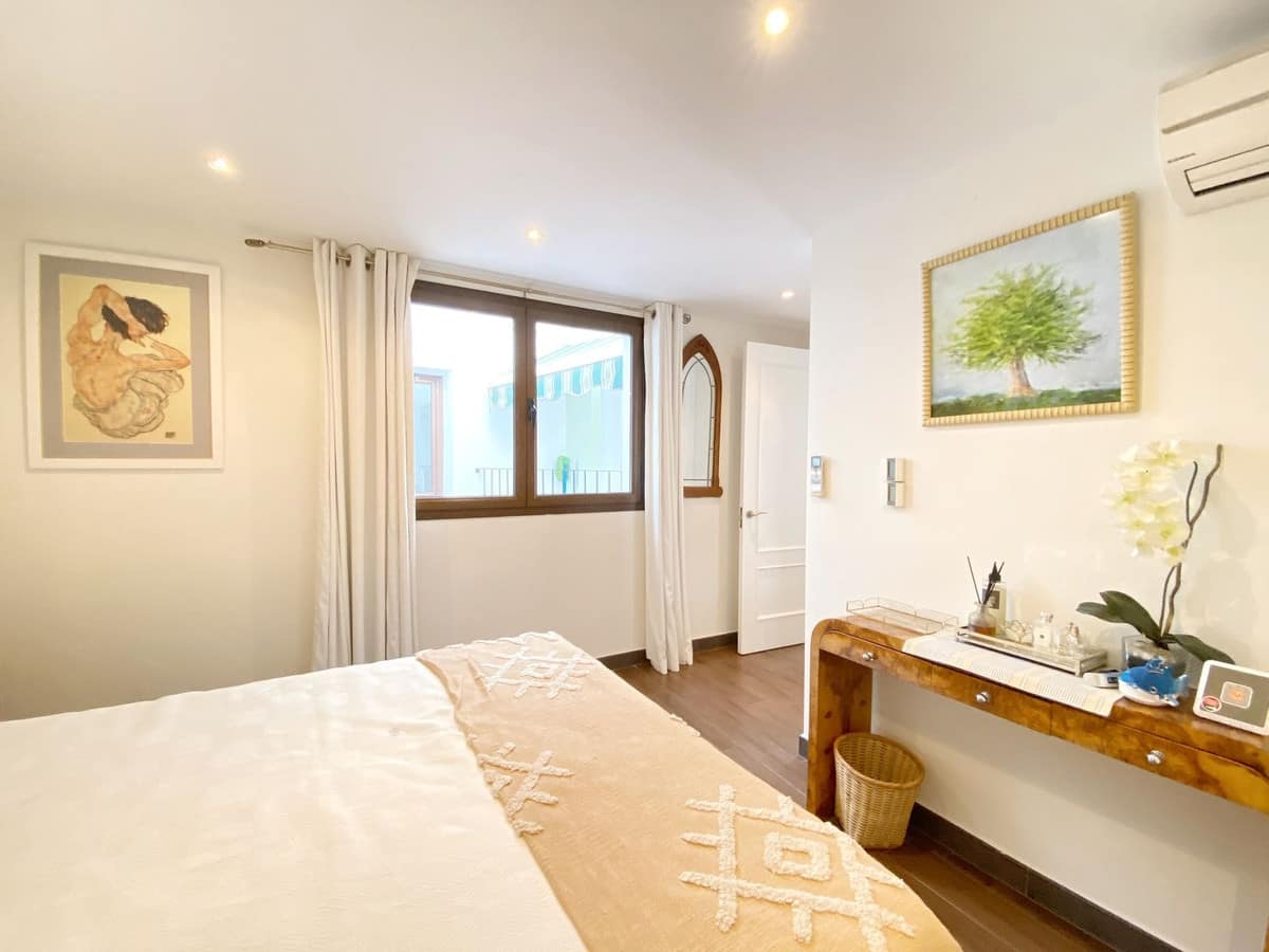 On the upper floor, there is an impressive living-dining room with balconies overlooking the street and another small balcony overlooking the house's interior courtyard. A modern kitchen with a central island. And two double bedrooms, both with en-suite bathrooms.