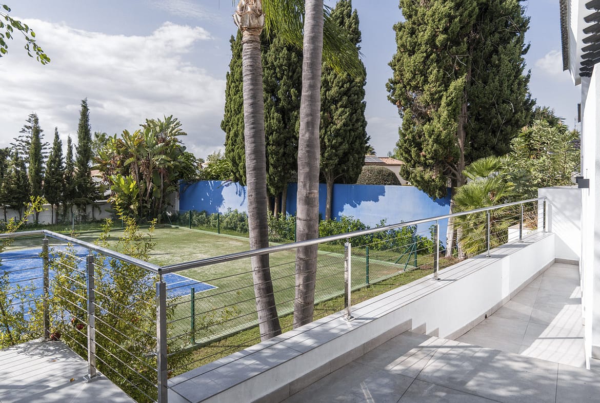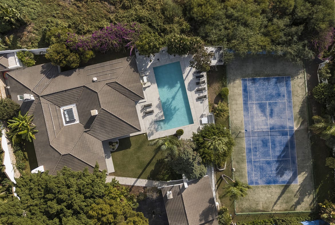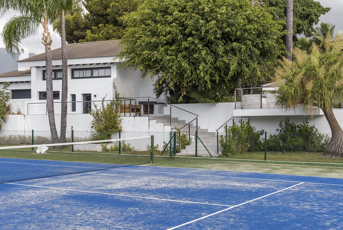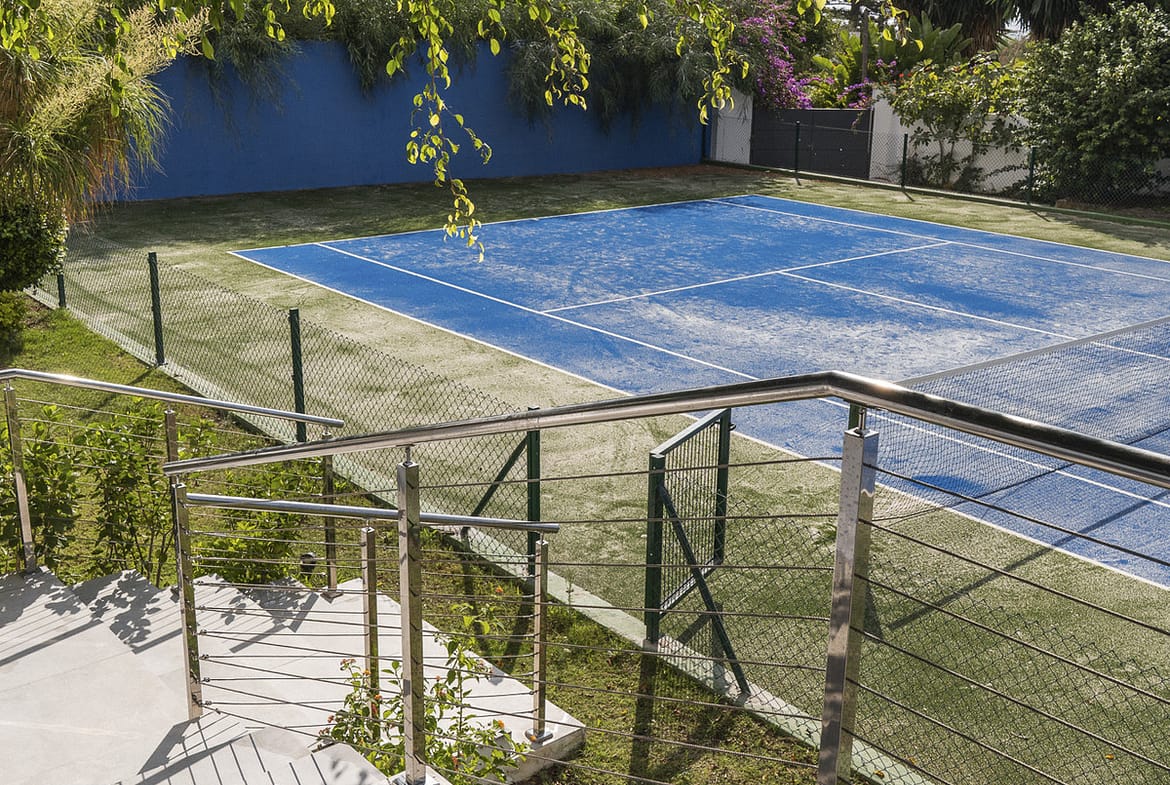 The villa offers an exceptional outdoor area, including a tennis court and a large garden. There is also a guest toilet and changing room—ideal for enjoying the outdoor lifestyle. Next to the stunning 14-meter-long, 2.5-meter-deep pool, you'll find an elegant outdoor dining area, perfect for entertaining.