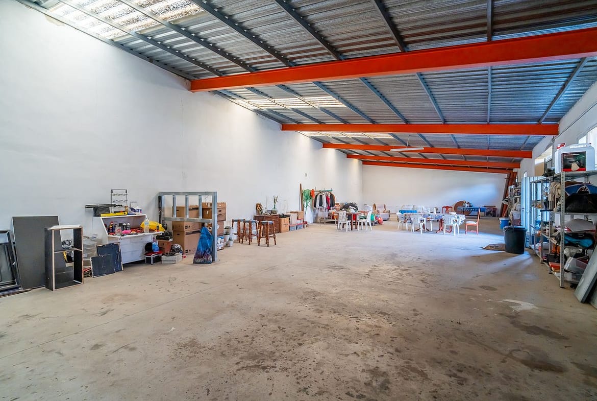 The property includes a two-storey detached house with more than 300 m² built and a large warehouse/storage building (approx. 300–400 m²), offering multiple possibilities such as residence, storage, workshop, or agricultural use.