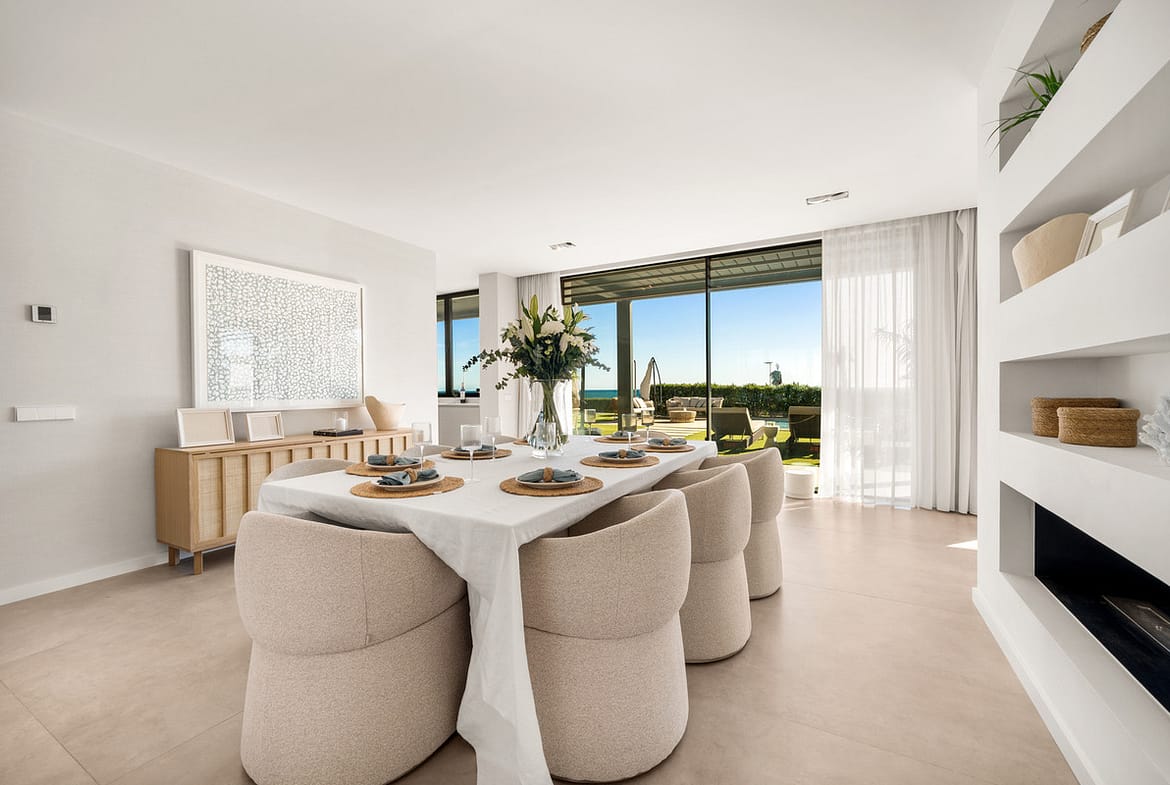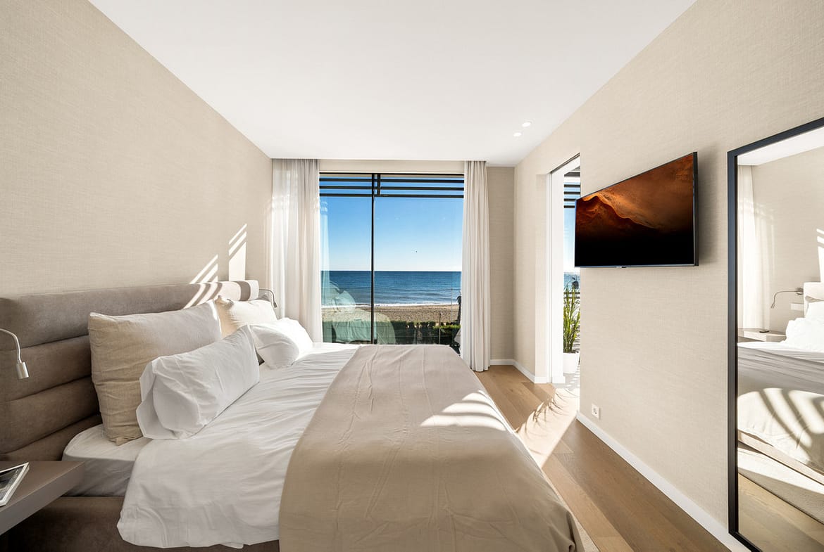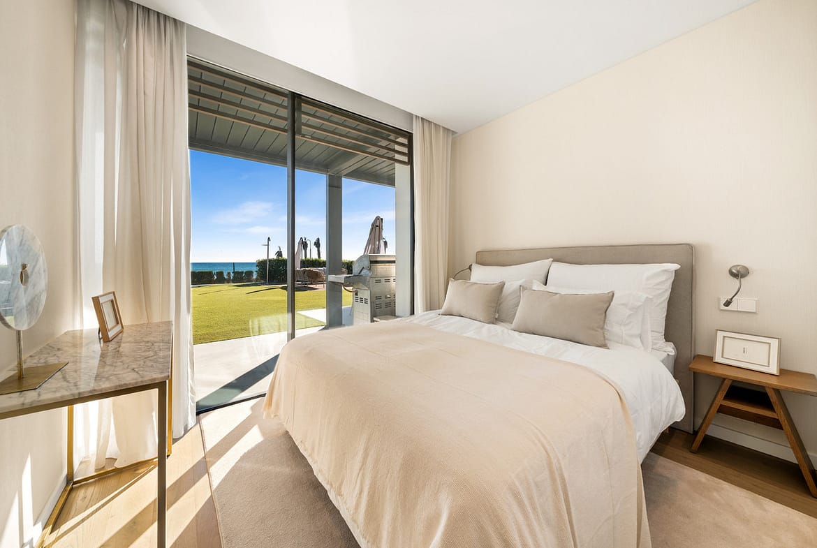 Boasting of panoramic sea views, a contemporary showpiece villa sitting in a privileged beachfront position in the New Golden Mile, surrounded by an expansive private garden with a large private swimming pool. The ideal family estate offering a dynamic outdoor lifestyle, perfect for water sports enthusiasts, with direct access to the beach from the front garden.
