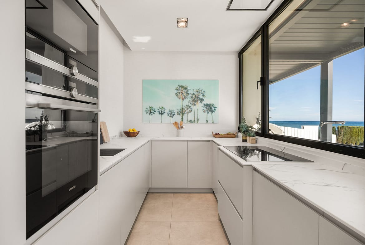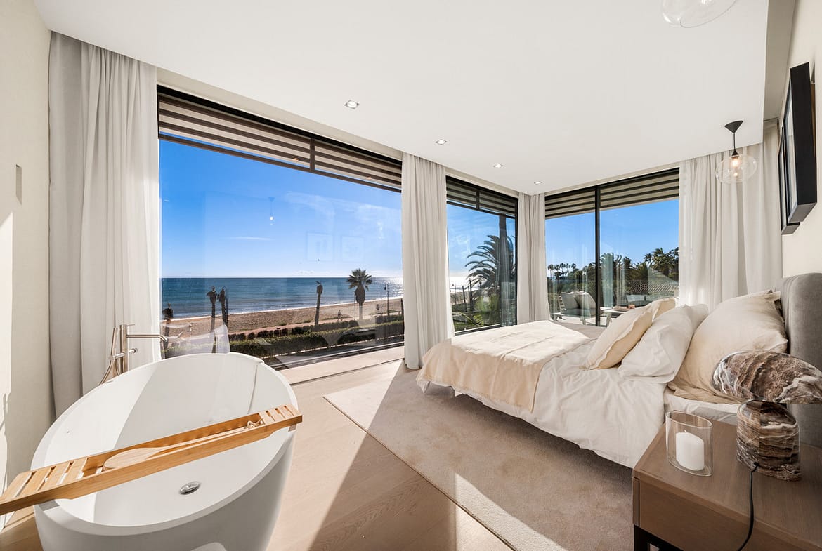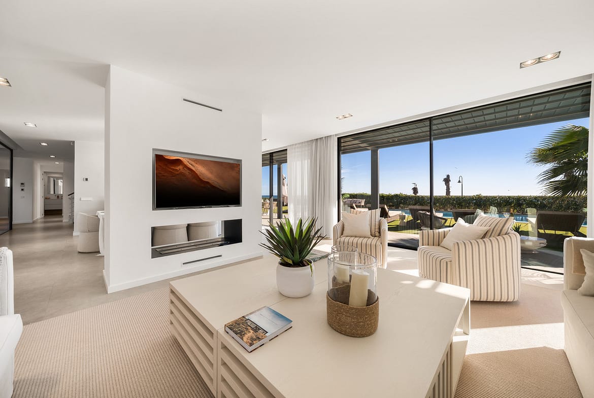 Boasting of panoramic sea views, a contemporary showpiece villa sitting in a privileged beachfront position in the New Golden Mile, surrounded by an expansive private garden with a large private swimming pool. The ideal family estate offering a dynamic outdoor lifestyle, perfect for water sports enthusiasts, with direct access to the beach from the front garden.