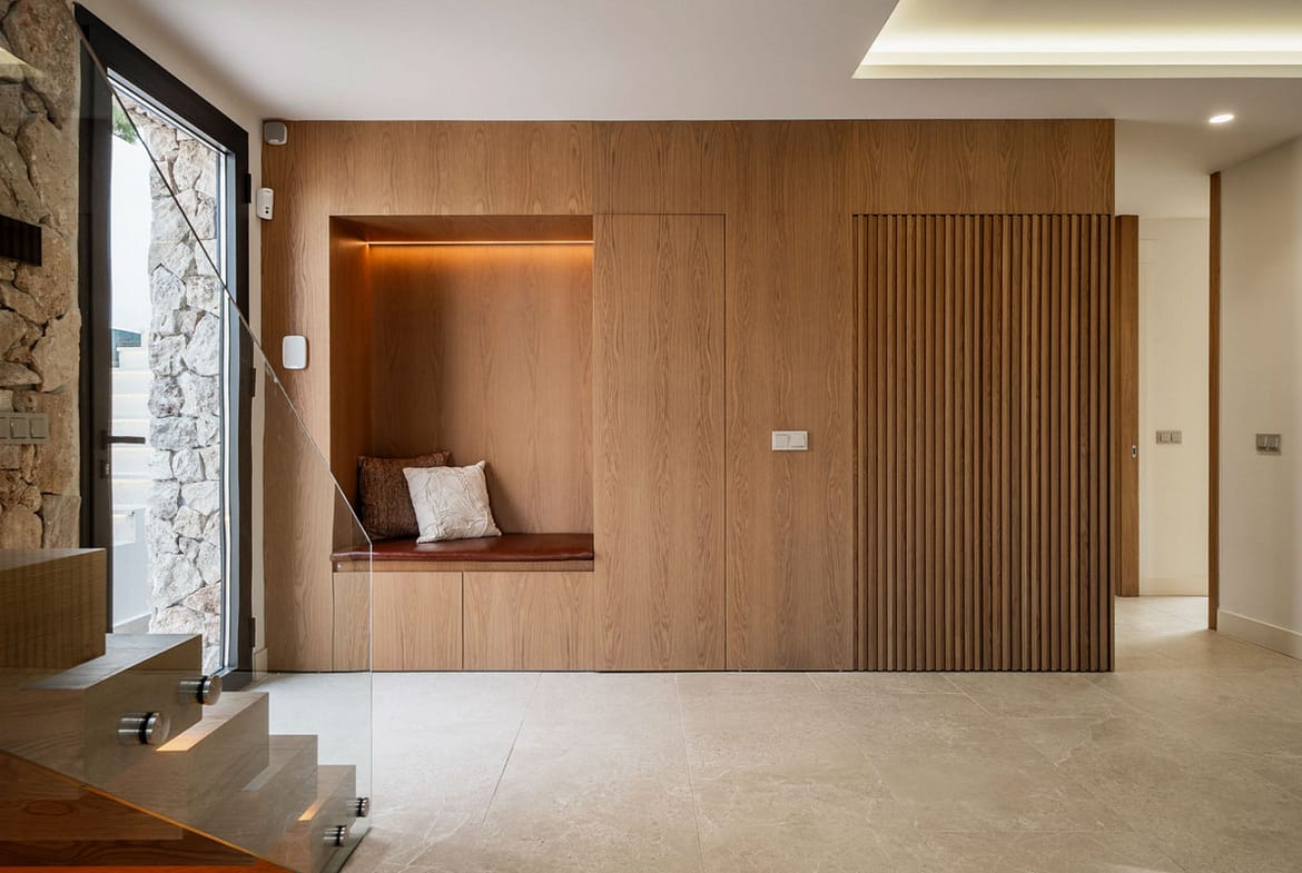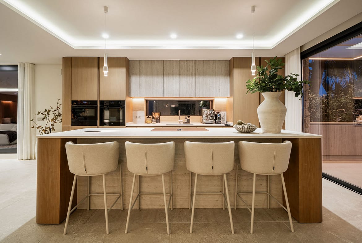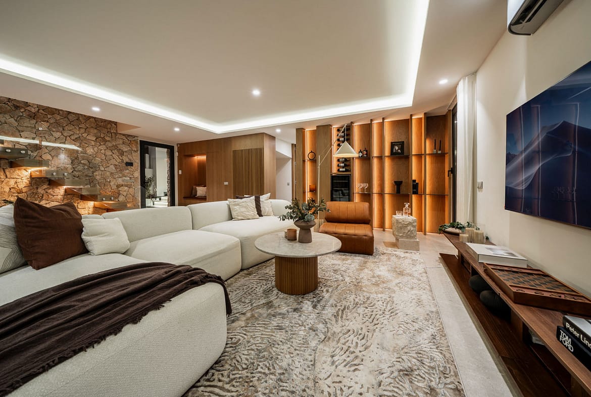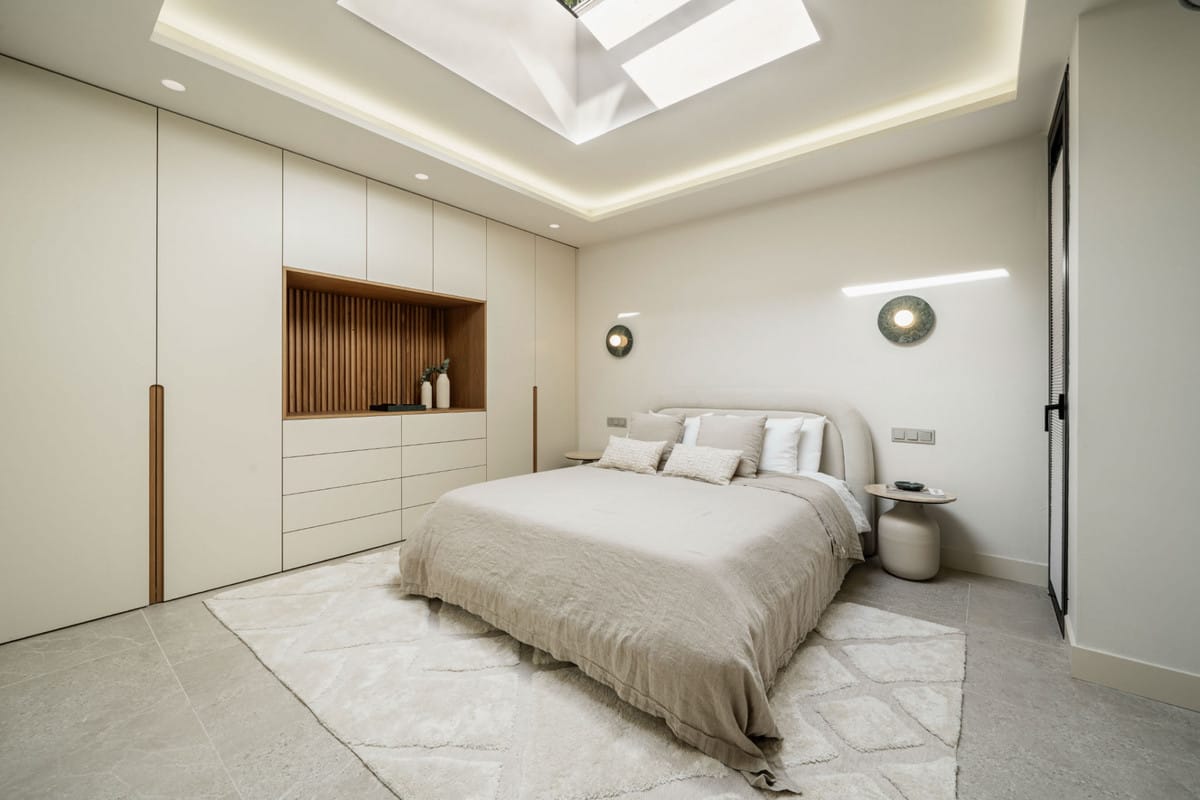 A rooftop terrace adds to the appeal, featuring a jacuzzi and panoramic 360° views. Whether used for sunrise yoga or sunset cocktails, this elevated space captures the very best of outdoor Mediterranean living. Interiors showcase high-quality finishes including porcelain flooring, custom wood cabinetry, and natural stone elements, providing a warm yet refined design language.