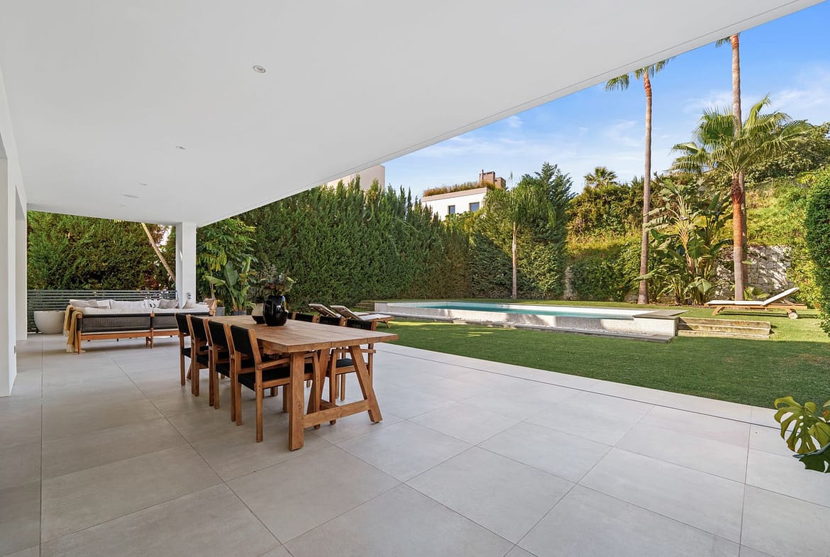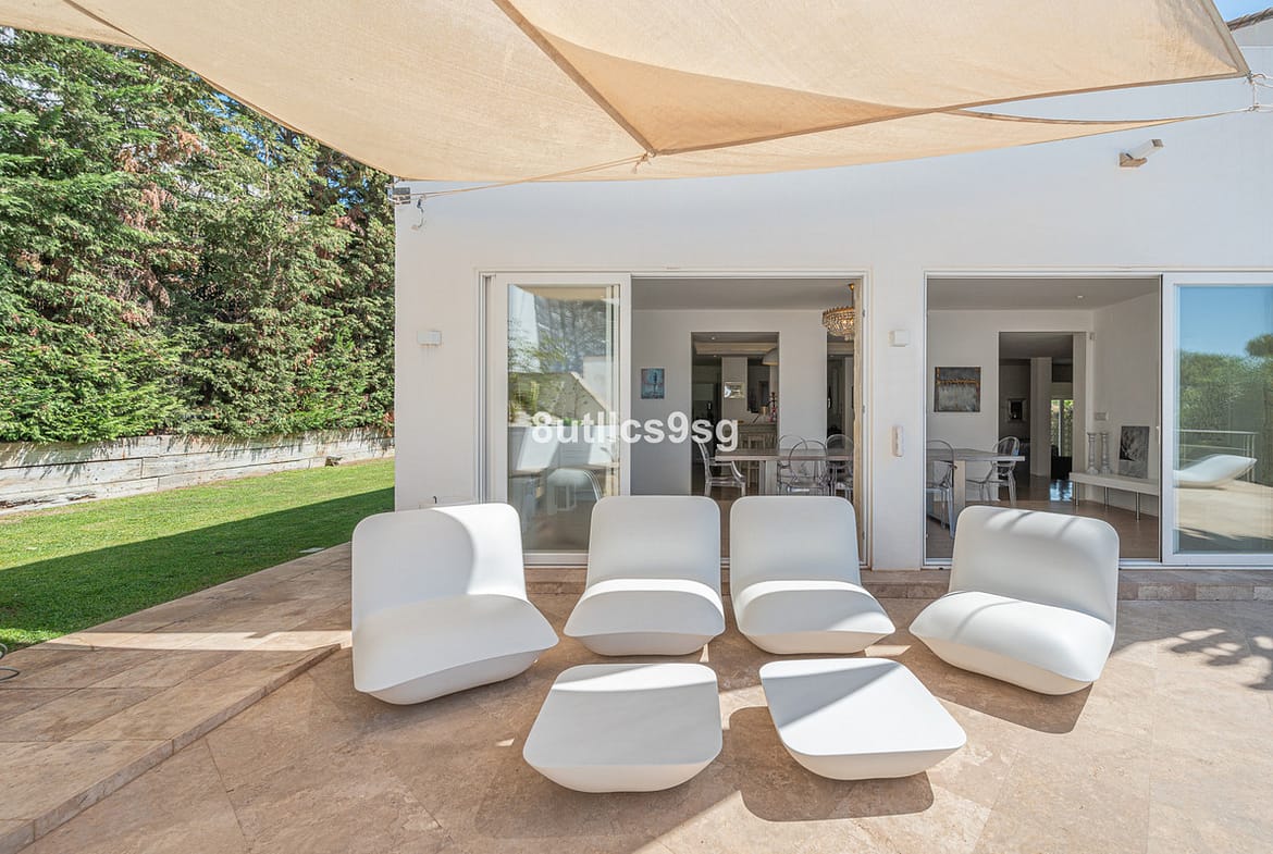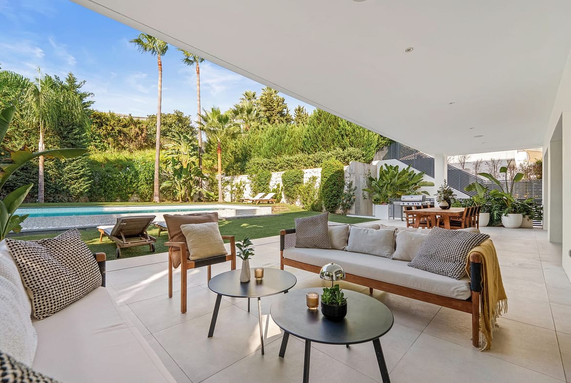 Situated in the highly desirable area of Nueva Andalucía, just minutes from the vibrant marina of Puerto Banús, this contemporary residence blends modern elegance with exceptional comfort and practicality. Designed with open-plan living in mind, the home features expansive sliding glass doors that blur the boundaries between indoor and outdoor spaces. Sunlight floods the spacious lounge and dining areas throughout the day, while the sleek, fully equipped kitchen—complete with refined cabinetry and a large central island—offers the ideal space for casual meals and social gatherings.