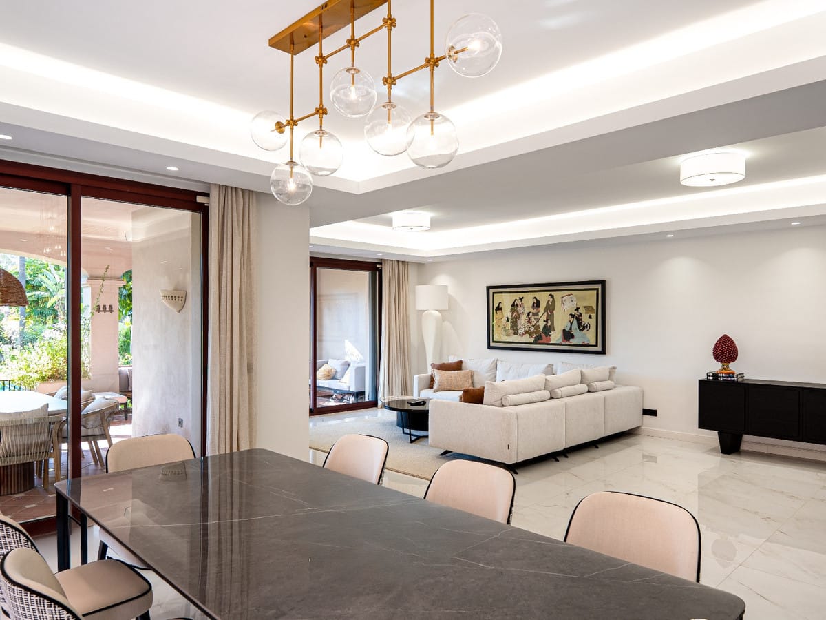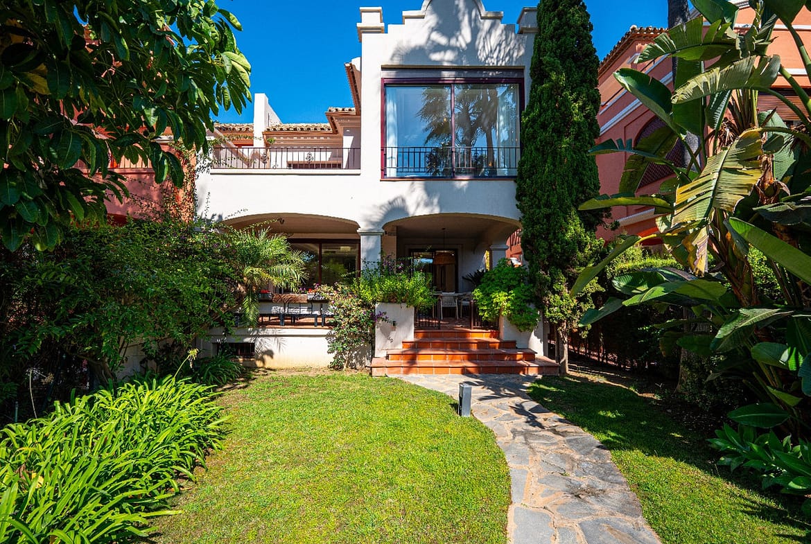 This is a fully renovated 5-bedroom, 4-bathroom townhouse spread over three floors in the heart of Nueva Andalucia. Just a short walk from the beaches and Puerto Banús, this modern home offers open plan living and dining, a private garden with pool, and a secure gated community with 24-hour security. The property includes a private garage for two cars and is designed for those seeking comfort, privacy and modern style.