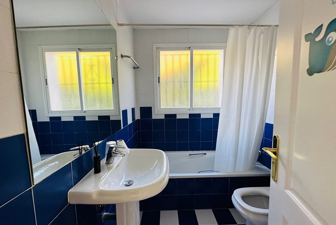 Spread over two levels, the ground floor of the villa features a spacious living and dining room, complete with a working fireplace, creating a warm and inviting atmosphere. From here, you can access the covered terrace and beautifully private garden, perfect for enjoying the Mediterranean climate.