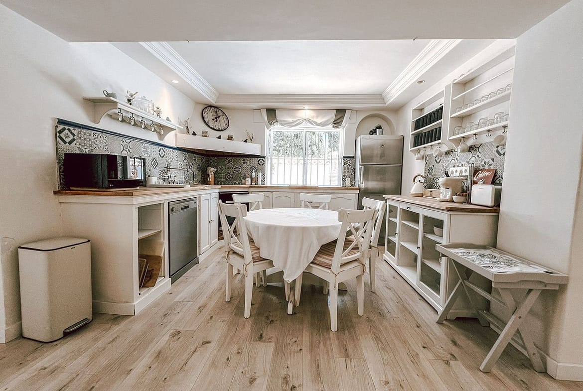 The exterior is one of its great attractions: a beautiful garden with numerous fruit trees, a large private swimming pool, and a jacuzzi for 6 people, perfect for enjoying the Mediterranean climate.
