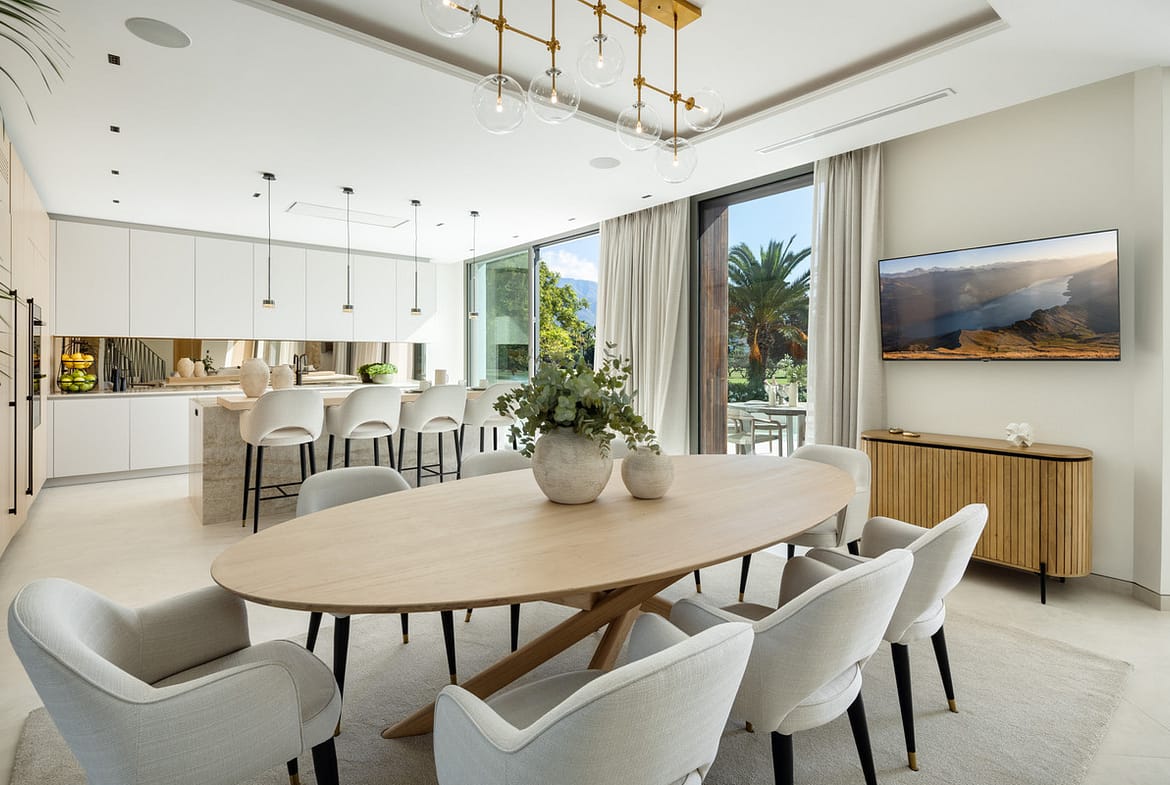 Upon entering, the villa reveals an inviting atmosphere where warm tones and elegant finishes blend seamlessly. The large archway and lead lights create a sense of grandeur, while wooden doors add rustic charm. The main living area is both functional and aesthetically pleasing, with an open-plan layout maximising space and light. Hidden warm LED lighting adds a cosy ambiance, and high windows frame breathtaking views of La Concha mountain, the golf course, and a serene lake with a fountain.