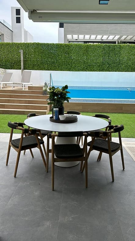 The villa features 5 spacious bedrooms and 4 bathrooms, with a bright and modern open-plan layout. The main living area seamlessly combines the lounge, dining space, and a fully fitted kitchen, creating an inviting environment perfect for both everyday living and entertaining.