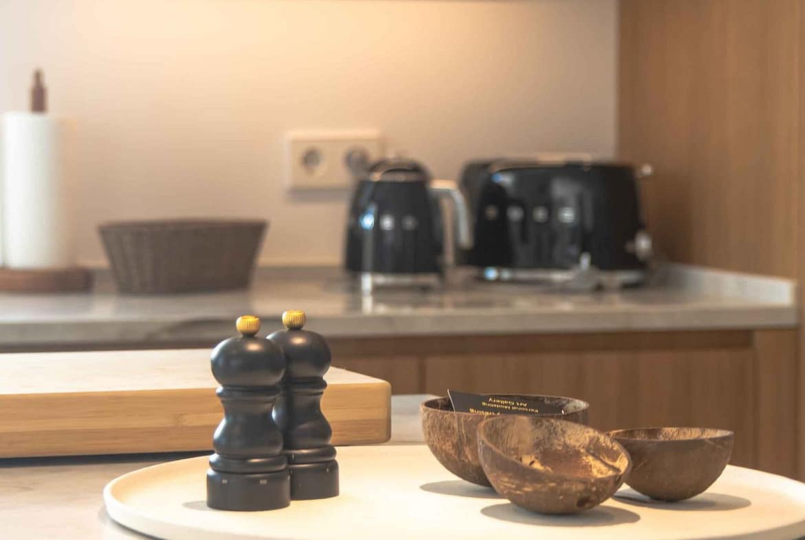 The main living area is arranged as an open-plan environment, where the lounge, dining space and fully fitted kitchen are visually and functionally connected. Large sliding doors extend the interior towards the terrace, reinforcing the relationship between indoor and outdoor areas. The kitchen is designed with integrated appliances and a central island, supporting both everyday use and hosting. Subtle ceiling detailing and material continuity contribute to a calm and cohesive spatial flow.