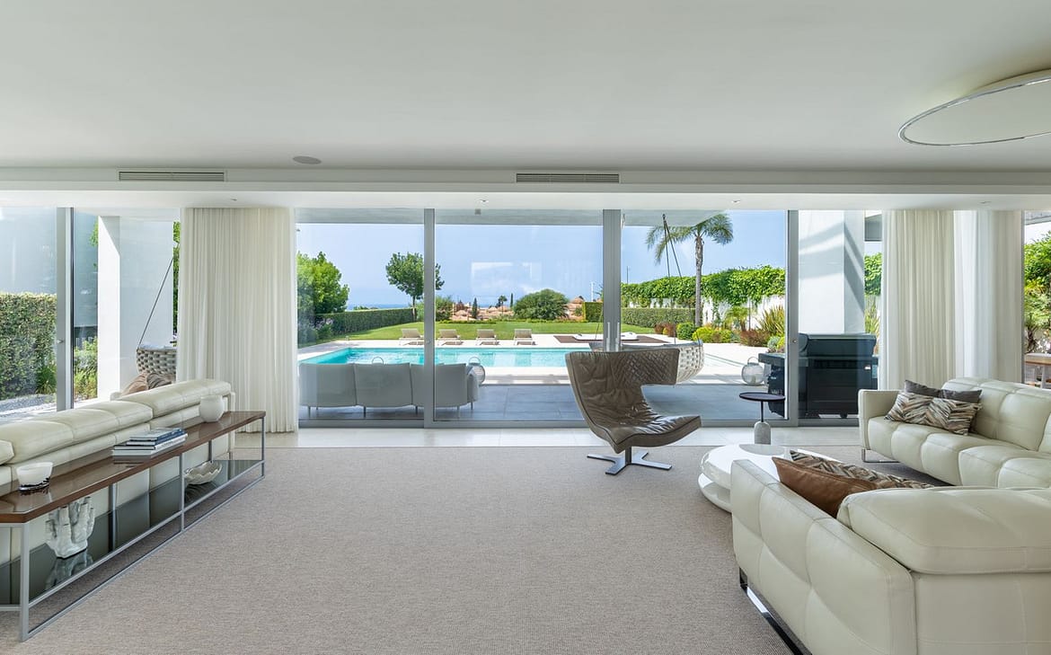 Entering through the impressive entrance hall, you are immediately greeted by views of the private pool, the well-kept garden and the sparkling Mediterranean Sea in the distance. Spacious floor-to-ceiling windows fill the house with abundant natural light, creating an atmosphere of space, luxury and harmony with the surroundings.