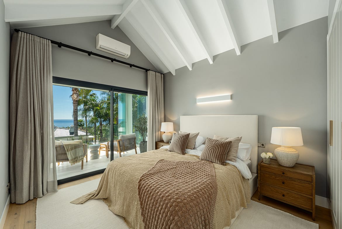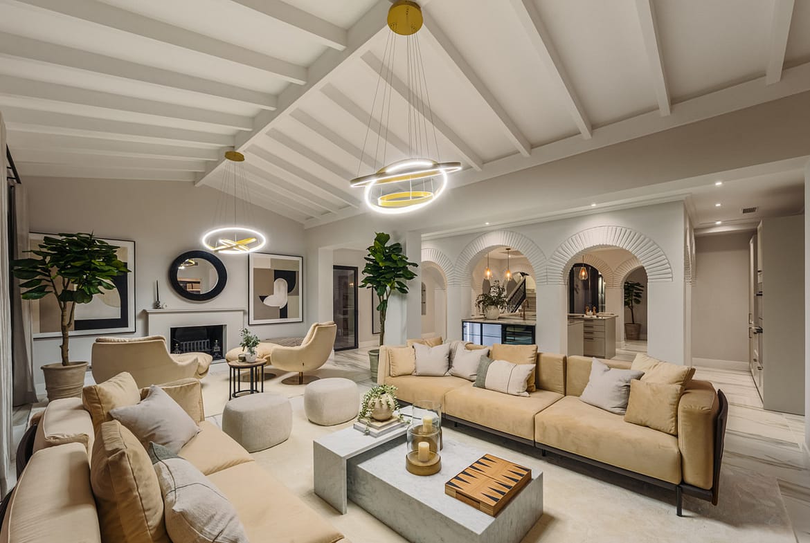 Inside, the villa enhances sophistication with its elegant use of natural tones and high-quality finishes. The expansive living area is highlighted by high ceilings with white-painted wooden beams, which enhance the villa’s Andalusian charm. This space seamlessly flows into the outdoor terrace, which includes a cozy lounge area, a dining table, and a barbecue zone, offering a wonderful setting for al fresco dining.