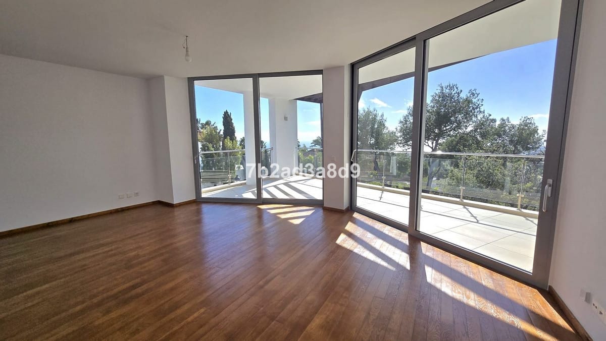 All bedrooms enjoy access to a wraparound terrace and offer built-in wardrobes, large glass doors, and light wood flooring. The elegant bathrooms are finished to a high standard with walk-in showers, bathtubs, and heated towel rails.