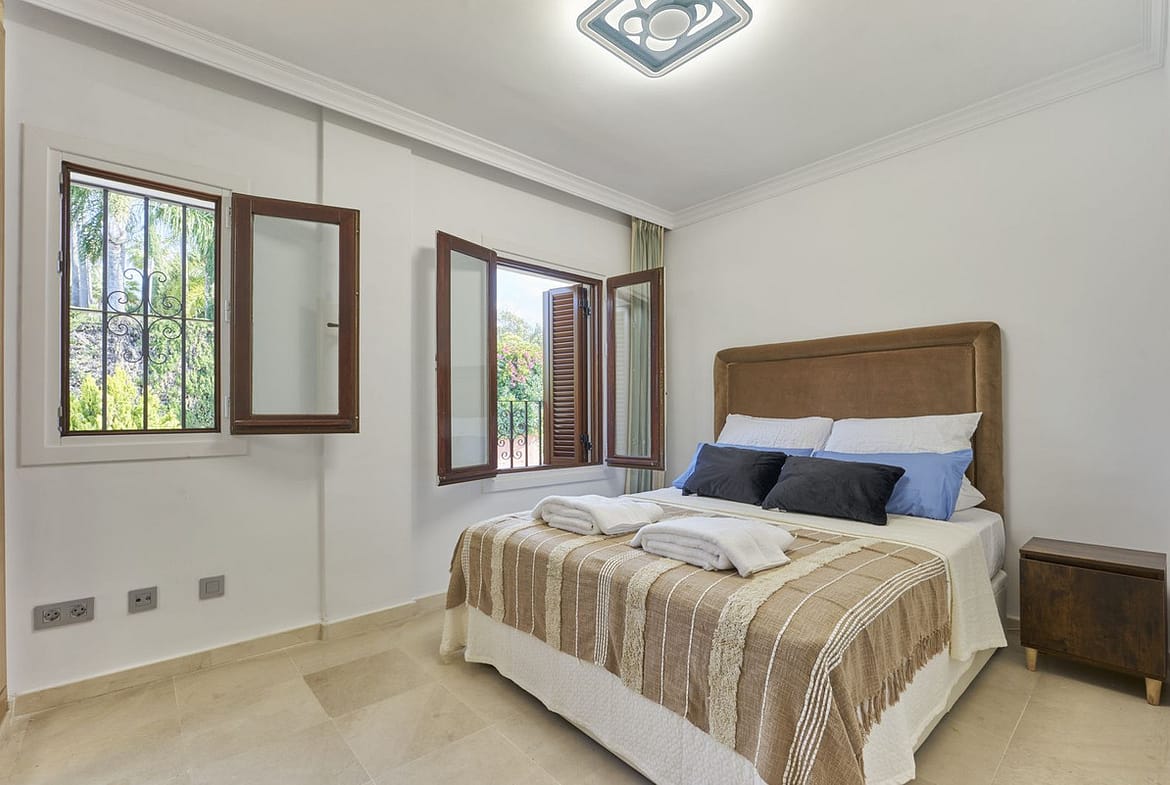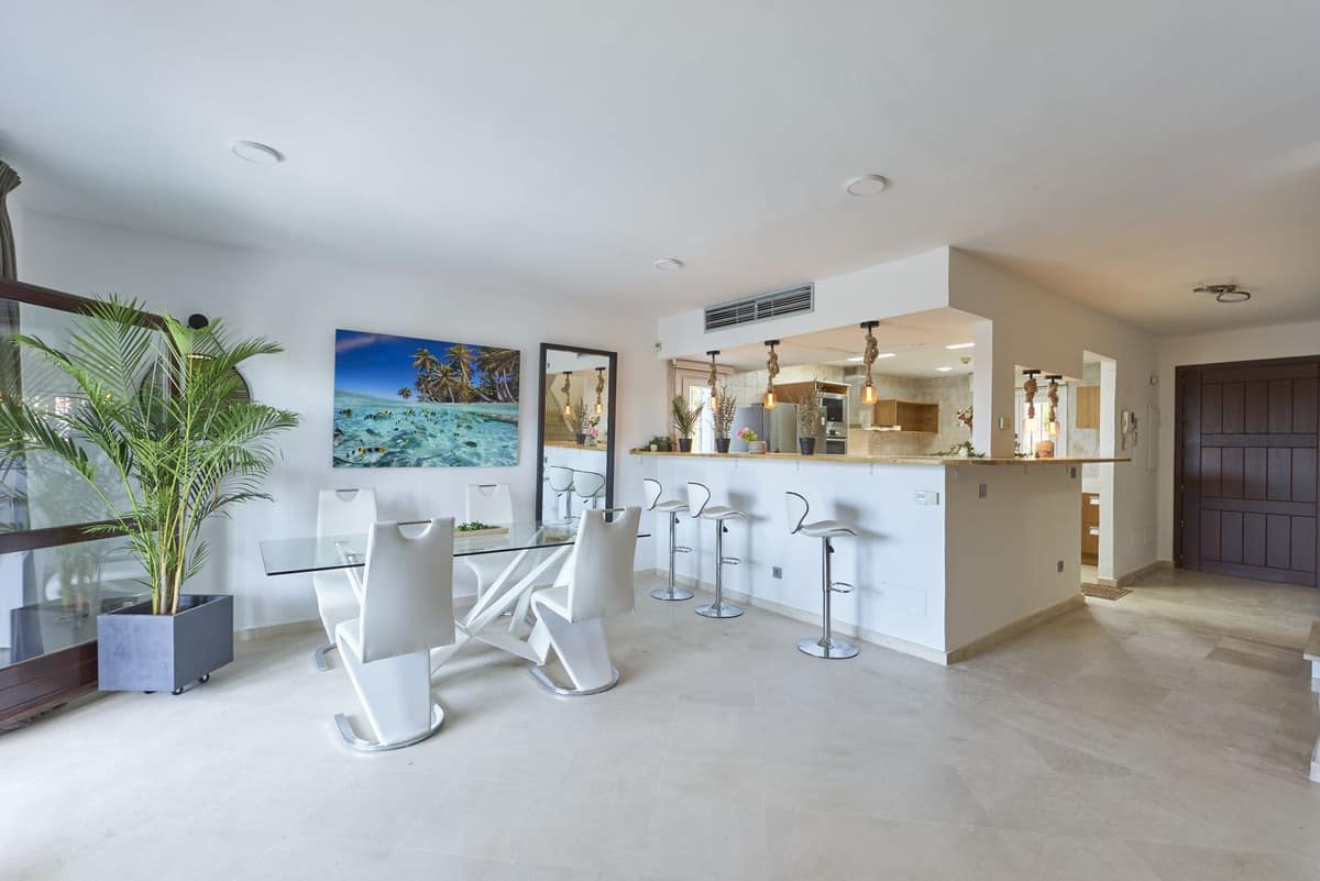 Nestled in a small community with expansive grounds, this three bedroom + bonus room, plus a self contained suite, Semi-Villa features a double-length swimming pool, a paddle court, and stunning views of both the sea to the south and La Concha mountain to the north. Inside, you’ll find marble floors, central air conditioning and heating, a high bar, and a terrace perfect for entertaining guests.