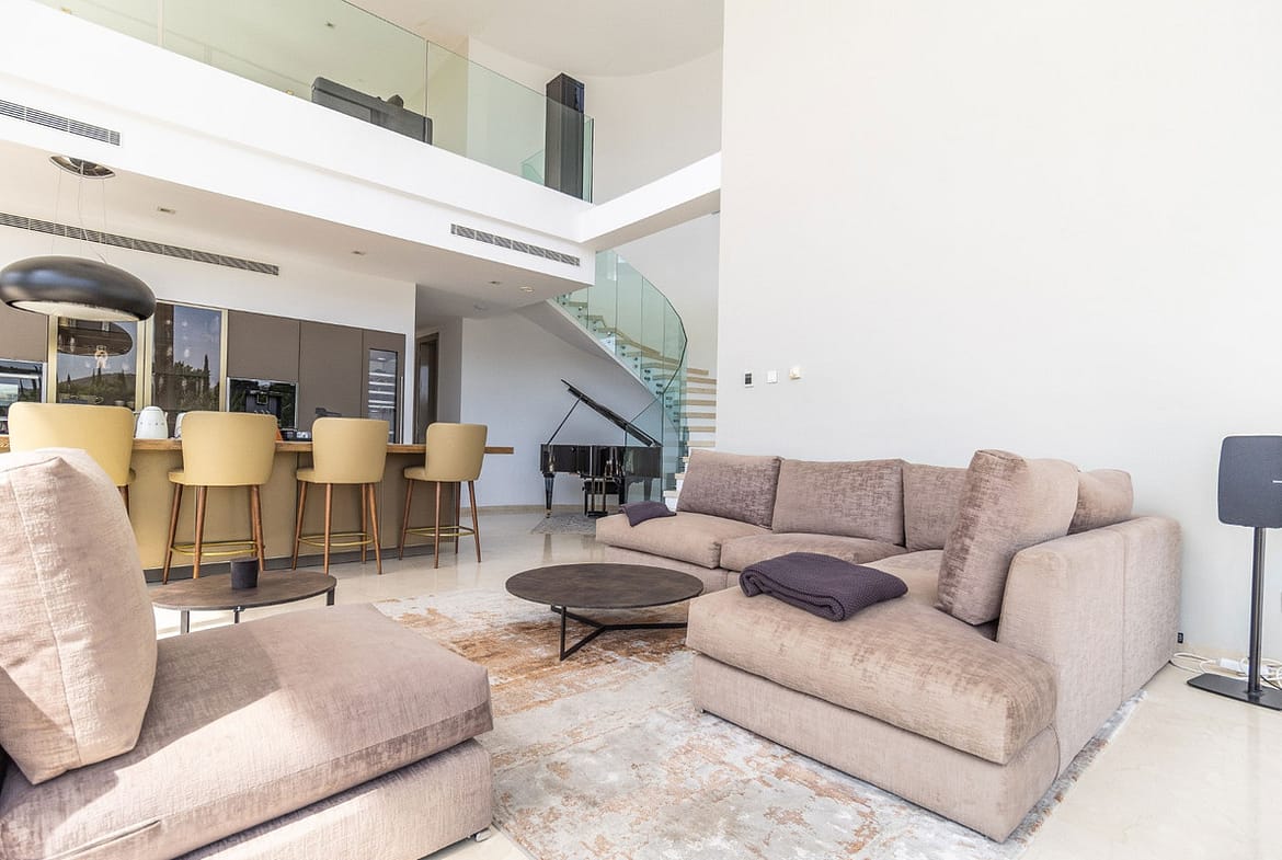 Upon entering the property on the first floor, you are captivated by the breathtaking panoramic views and the expansive glass facades of the villa. This level boasts a fully fitted kitchen with top quality appliances, a spacious living and dining area enjoying the views, and several bedrooms. The property also includes a private lift for easy access to all floors. On the lower floor, garden level, there is another open plan kitchen with large breakfast bar, leading into the living area that continues onto the terraces and gardens, plus additional bedrooms. The top floor boasts the master bedroom suite plus another guest bedroom, a solarium terrace, perfect for enjoying the stunning views.