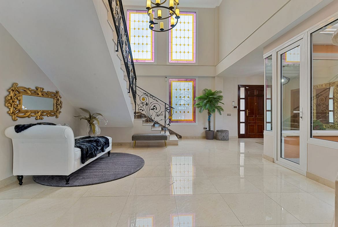 The villa welcomes you through an impressive foyer crowned by a majestic staircase, setting the tone for the elegant interiors that follow. The main floor features a generously proportioned living room with a fireplace, a formal dining room and a second separate and cosy dining room, also with a fireplace, perfect for more intimate gatherings.