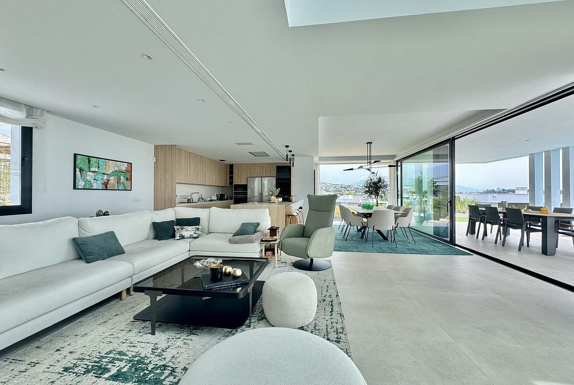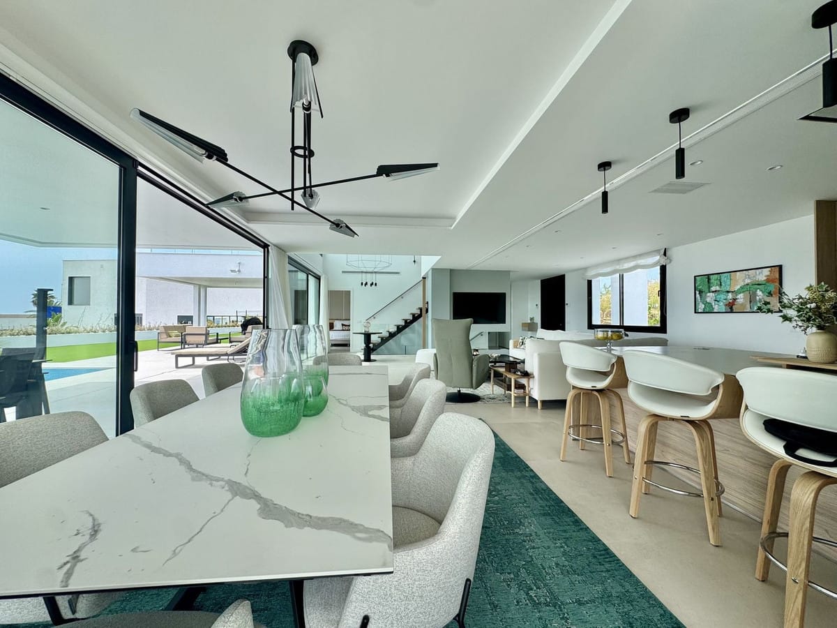 On the main floor, there is a spacious open-plan living area, decorated with minimalist taste and high-end finishes. From here, you have direct access to a covered terrace with a chill-out zone and a completely private pool, ideal for relaxing and enjoying the Mediterranean lifestyle.