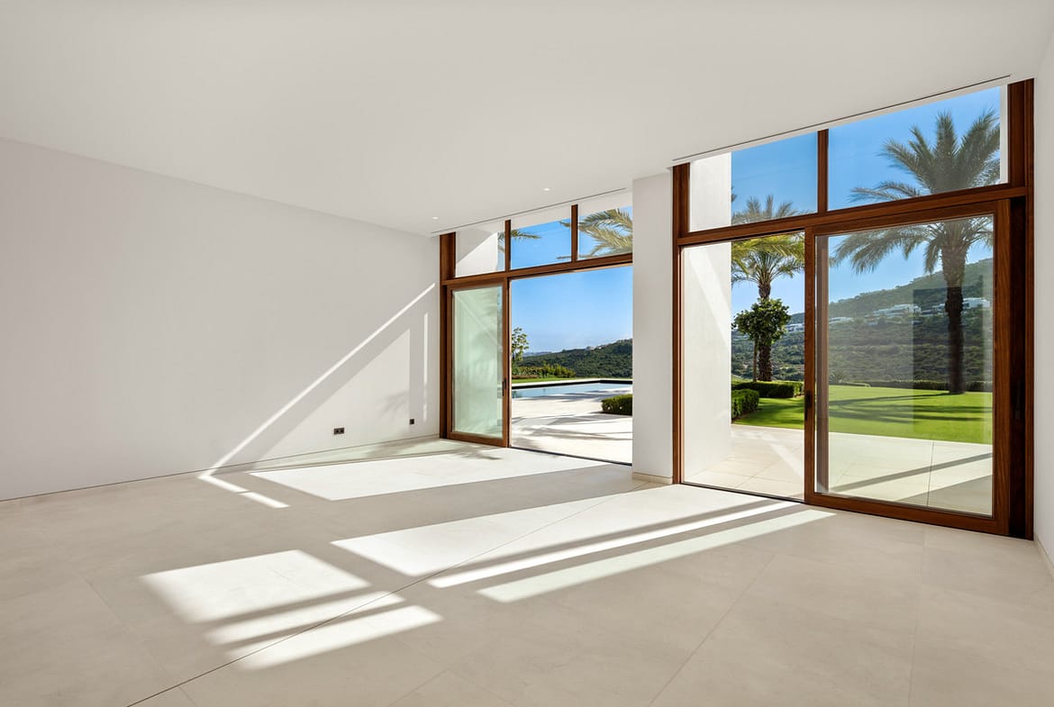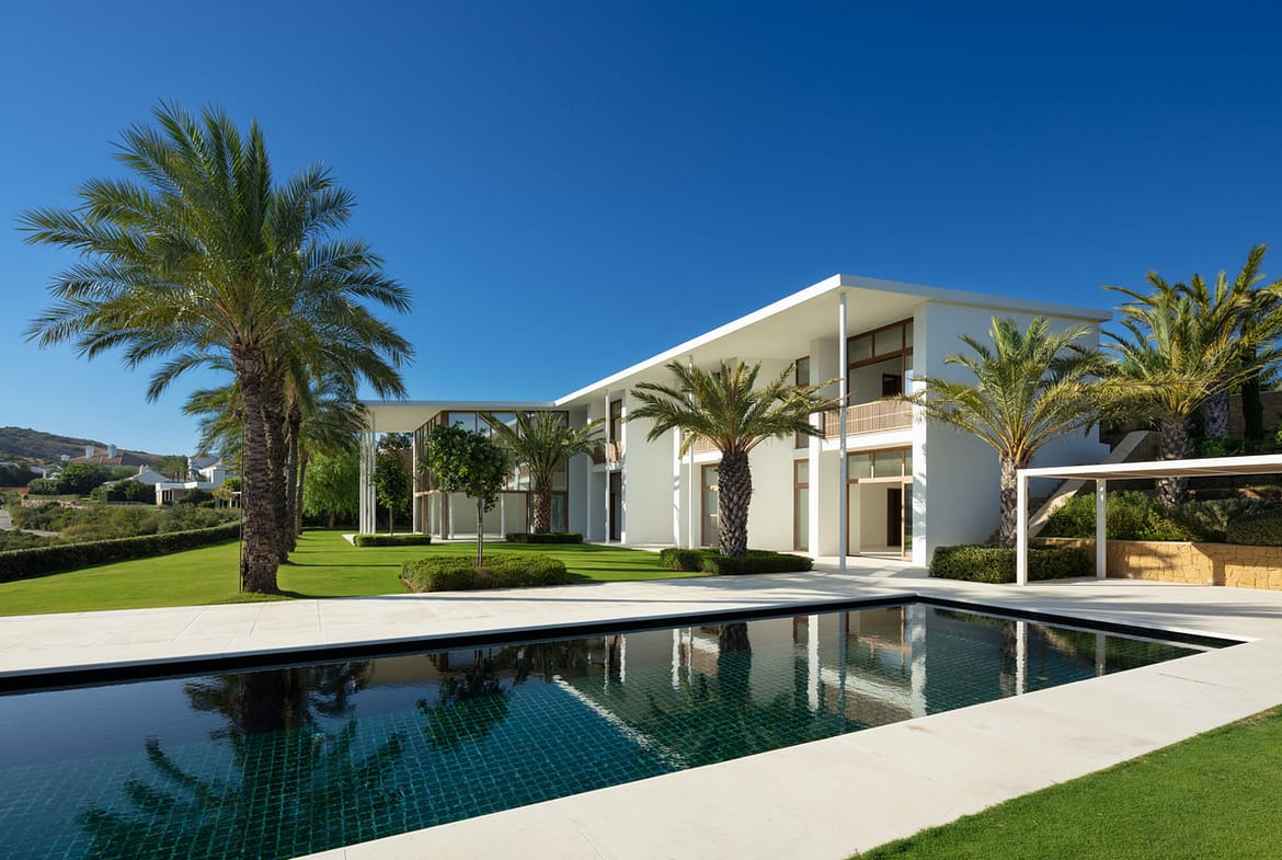 This exceptional residence, exclusive to the Finca Cortesin resort, exudes a captivating blend of luxury and elegance. Designed by the renowned Jose Maria Sierra architects, this architectural masterpiece stands unrivalled on the Costa del Sol, boasting a remarkable plot and breathtaking views. The property showcases an abundance of floor-to-ceiling windows that grace both levels, allowing natural light to flood the interiors. Its striking white facade, embellished with wooden accents, sets the tone for a seamless transition between the exterior and interior spaces. Of particular note is the impressive ceiling height, soaring to an astonishing 9 metres in the ground-level living area. A unique feature is the smaller living area on the top floor, providing a vantage point overlooking the ground-floor living space—a private retreat, akin to a concealed terrace within the property. The upper level is dedicated to the master bedroom and two guest rooms, each offering their own allure with stunning views of the golf course and Mediterranean Sea. The lower level encompasses the remaining bedrooms, living area and kitchen—a harmonious blend of functionality and style. The entire ground floor effortlessly opens up to the garden, welcoming fresh air and natural light into the property. The crown jewel of this residence is the spectacular garden, expansive in size and meticulously manicured. A haven for outdoor enthusiasts, the garden boasts an enticing pool with dark azure tiles that beckons for a refreshing swim, while the integrated gazebo next to the pool provides an idyllic setting for relaxation. Majestic palm trees line the garden, complementing the sweeping vistas of the golf course and Mediterranean coastline. Delightful landscaping, featuring stunning flower beds and meticulously trimmed bushes, adds a touch of natural beauty. With its privileged frontline golf location, awe-inspiring architecture and unparalleled ambiance, this truly unique property stands as a testament to the allure of the Finca Cortesin Resort.