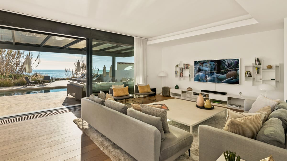 Stunning Frontline Beach 6 Bedroom 4 Bathroom Contemporary villa, located right on the beach at Costabella, East Marbella and only a 10 minute drive to the centre of Marbella and Puerto Banus.