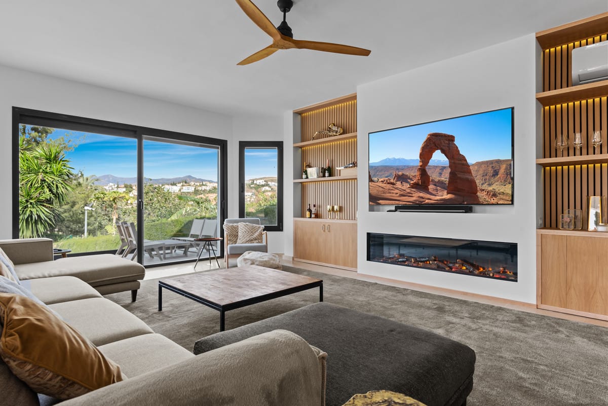 For relaxation and wellness, the villa offers its own private cinema room and fully equipped gym. The expansive open plan main living area flows seamlessly into a large dining space and main terrace, where you can enjoy panoramic views of Gibraltar.