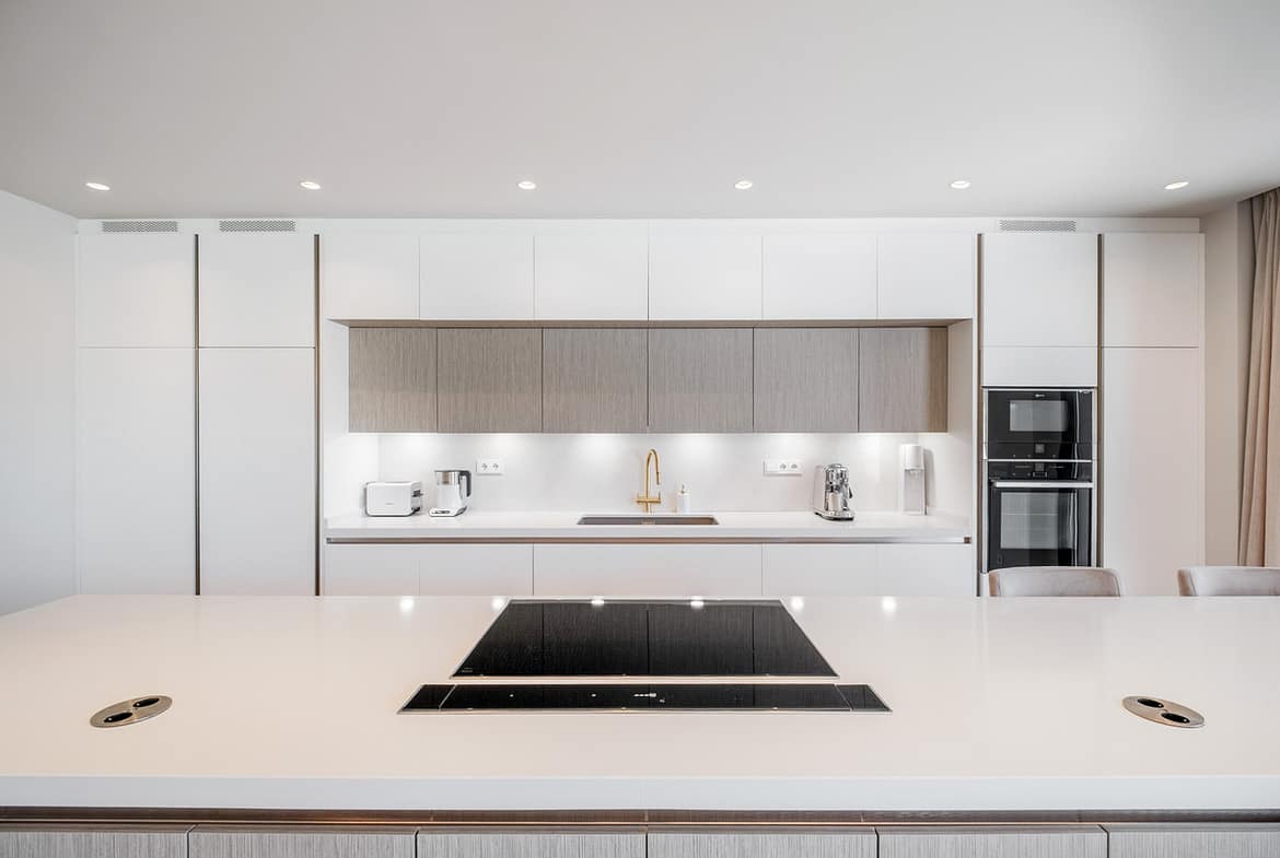 The property features an elegant entrance hall leading to a spacious living and dining area with fireplace, creating a warm and inviting atmosphere. The modern designer kitchen is fitted with bespoke cabinetry, Neff appliances, and a stylish Silestone countertop. From the living area there is direct access to the large terrace, the landscaped private garden, and the impressive swimming pool. The pool is finished with beautiful emerald-colored gresite tiles and has pre-installation for heating, while the garden offers a peaceful and private outdoor space ideal for relaxing or entertaining.