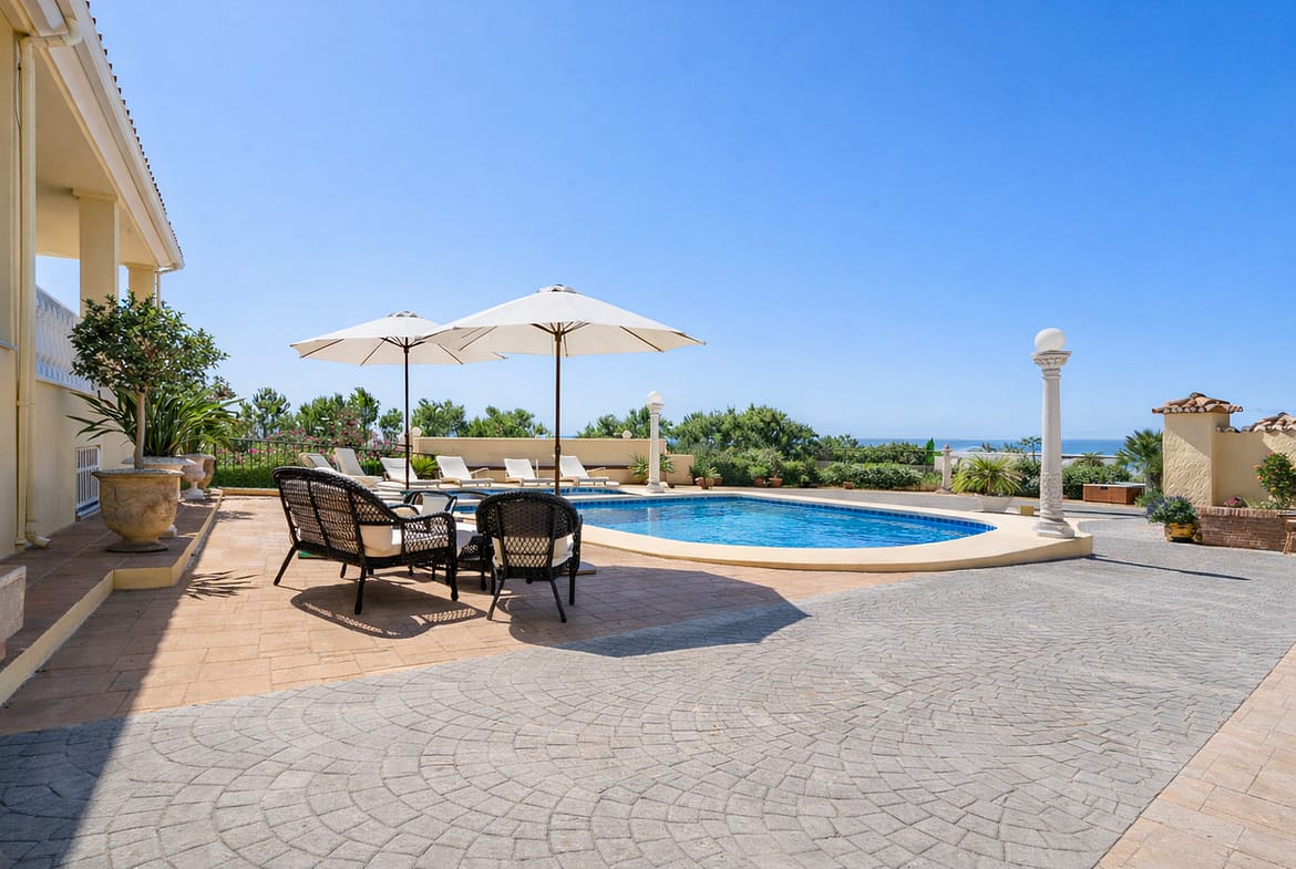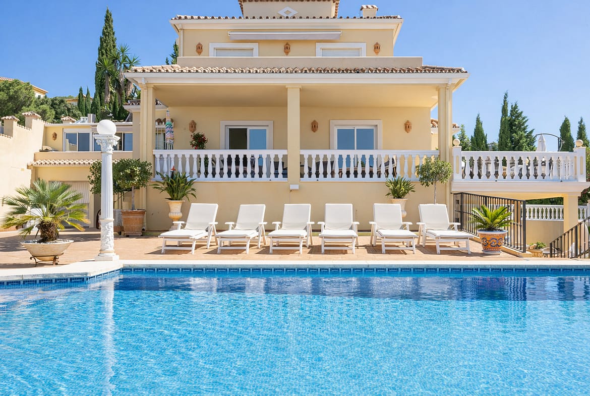 Outdoor living is a key feature, with a heated swimming pool, spacious terraces, mature gardens and multiple leisure areas designed for year-round enjoyment. The large plot includes approximately 50 orange trees, garden lighting, a private well supplying fresh water from Sierra Bermeja, and a 50,000-litre water tank, offering both charm and self-sufficiency.