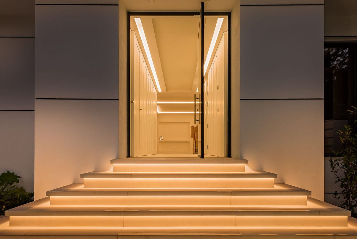 The outdoor area is designed for year-round living: a heated covered porch with underfloor heating, 11×5 m pool with night LED lighting, integrated BBQ area, and landscaped gardens with smart irrigation.