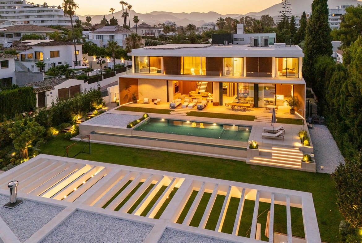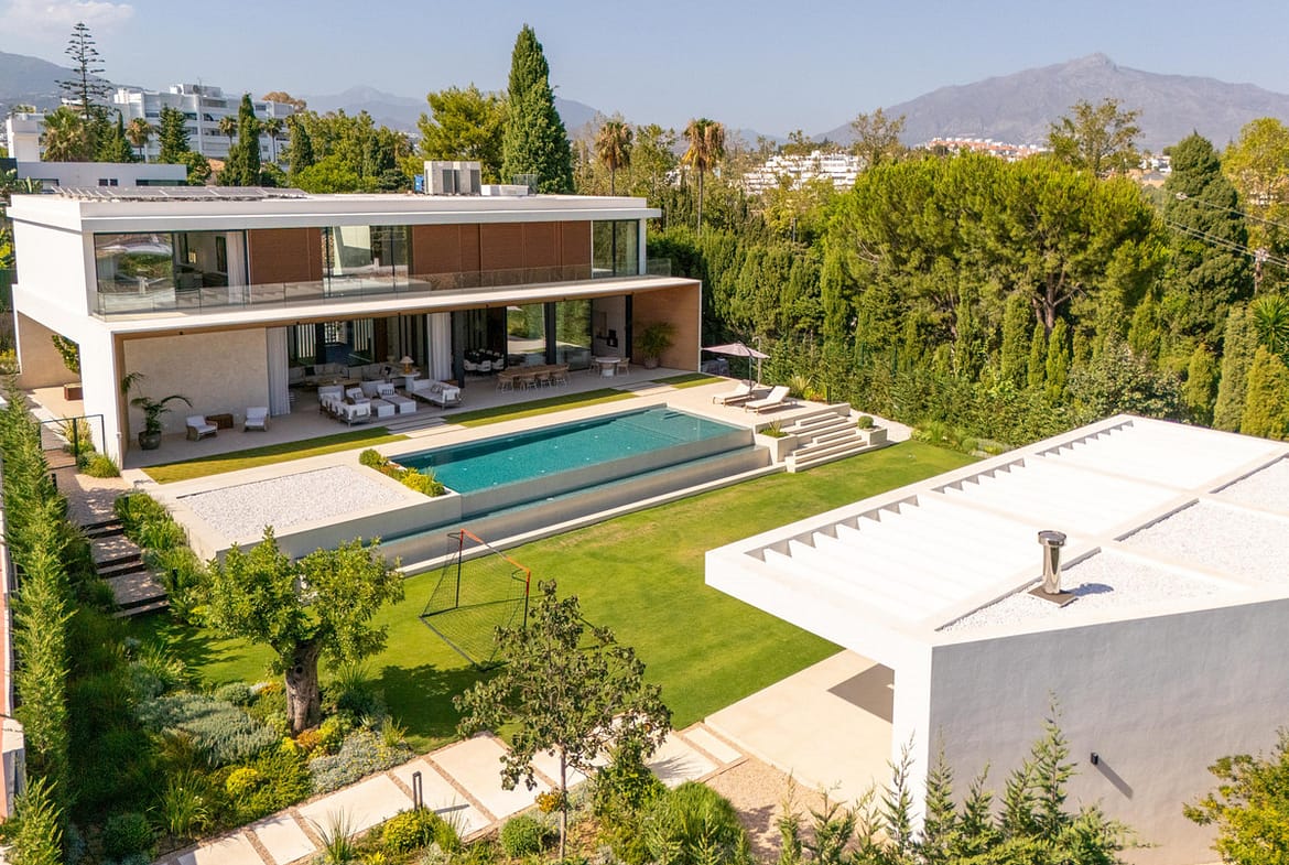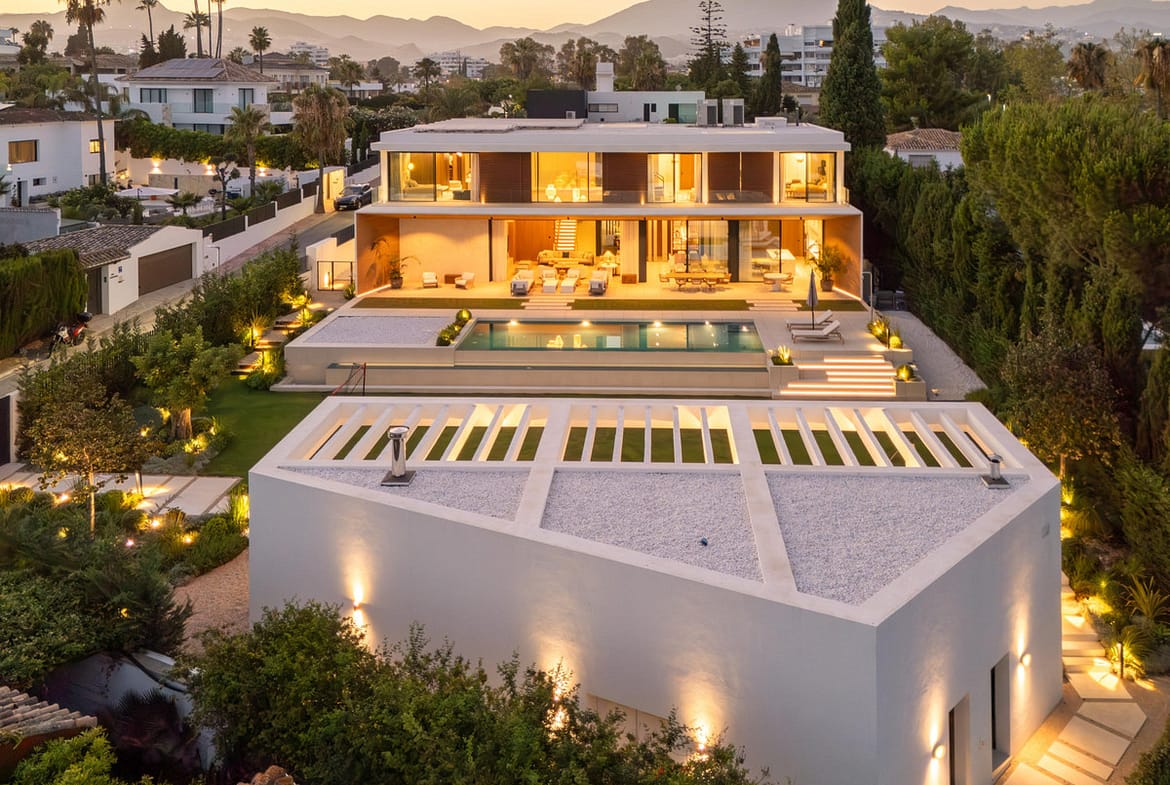 This contemporary six-bedroom villa is located in the prestigious Guadalmina Alta area of Marbella. Blending striking modern architecture with practical living, it features clean lines, extensive glazing, landscaped gardens, and exceptional curb appeal.