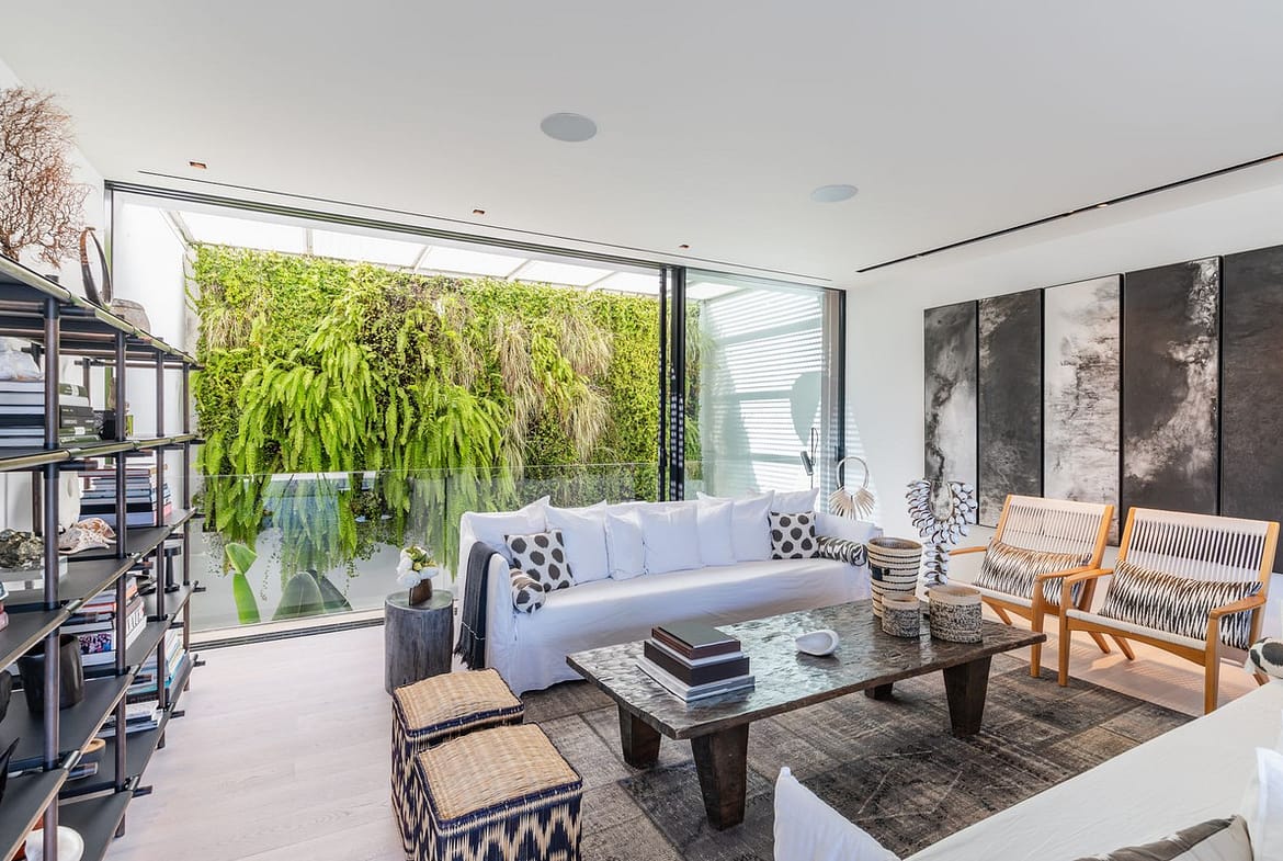 From the moment you step inside, the house immediately frames the Mediterranean panorama. The entrance level features a spacious lounge area and several bedrooms, all oriented toward the sea and the landscape. Large floor-to-ceiling windows and generously sized doors open wide to welcome natural light and the refreshing coastal breeze, creating a continuous sense of openness throughout the space.