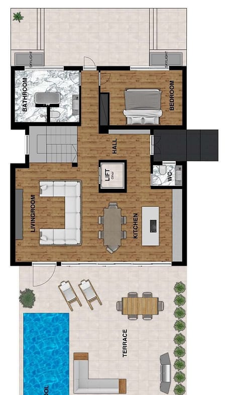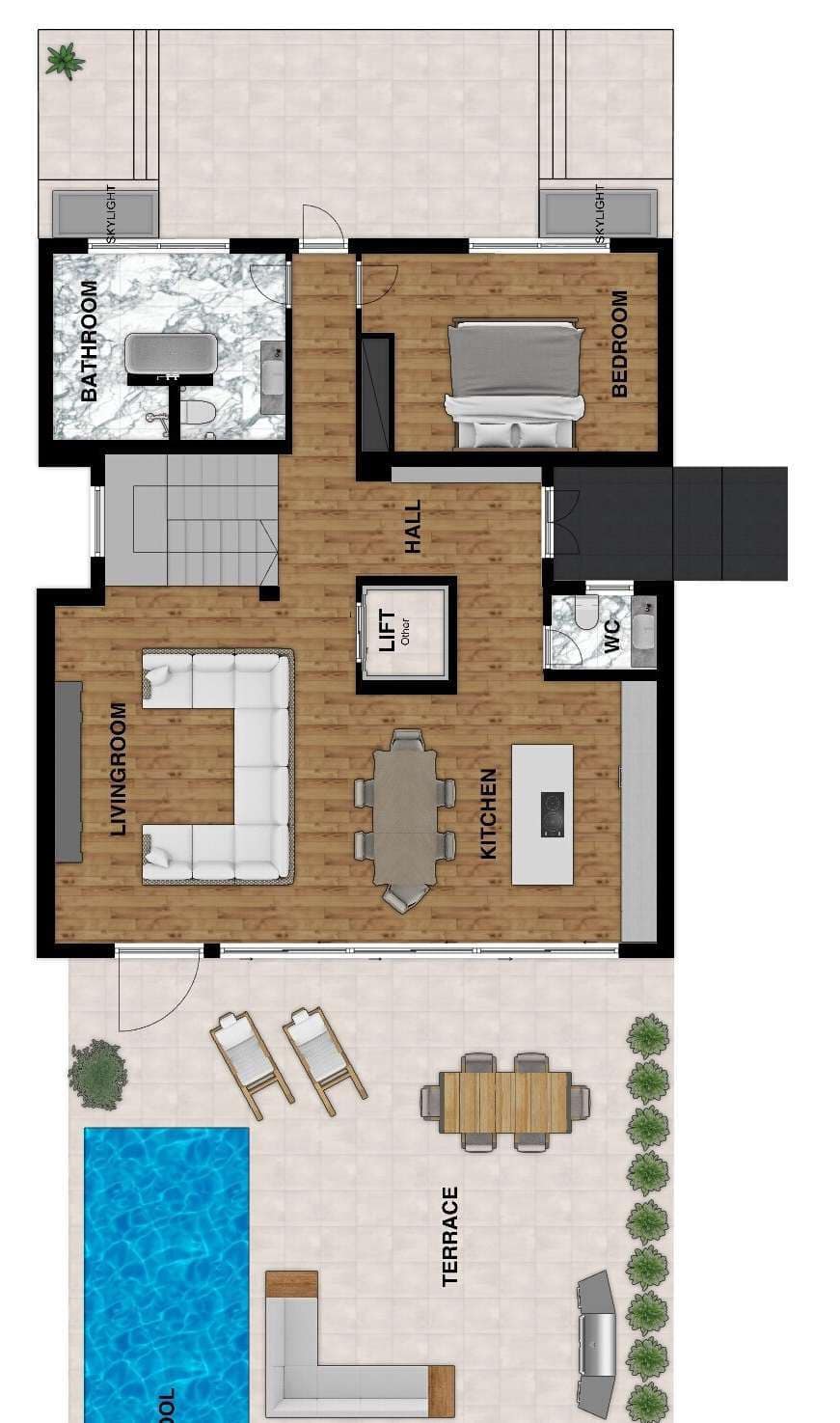 The roof terrace will be equipped with a jacuzzi, shower and an outdoor kitchen. Natural oak parquet is used on the floors of the house.