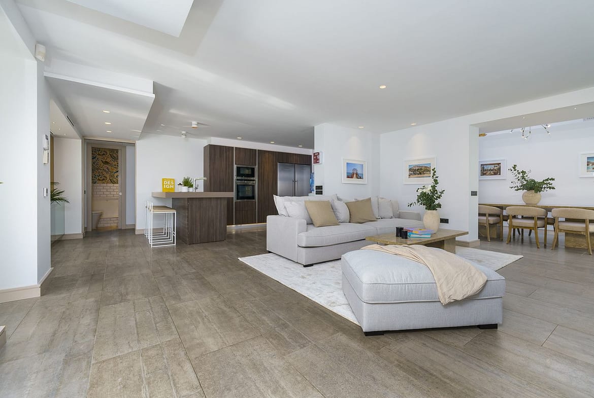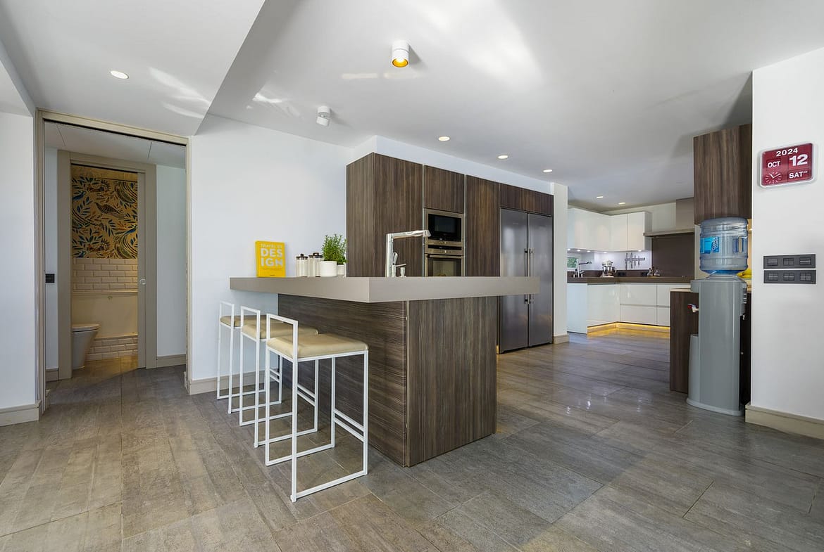 The upper floor offers an additional living space, a guest bedroom with a walk-in closet and en-suite bathroom, and a luxurious master suite complete with a large walk-in wardrobe and an elegant en-suite bathroom. From this floor, you can access the impressive solarium terrace, which offers stunning sea views, ample chill-out areas, and sun decks—perfect for relaxing or entertaining.