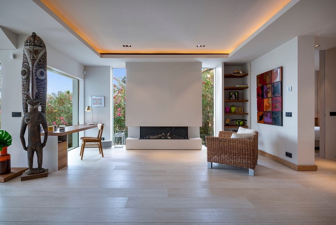 The villa’s interior is meticulously finished, featuring marble floors with Under Floor heating all over the house, a grand living room with a fireplace, and a separate dining room. The fully fitted kitchen is complemented by a utility room and a kitchenette, ideal for culinary enthusiasts. Entertainment is at the heart of this home, with a dedicated cinema room, games room, Dolby Stereo Surround system, and several terraces—both covered and uncovered—providing mountain, sea, garden, and pool views. Additional spaces include an office room and ample storage, ensuring practicality alongside luxury.