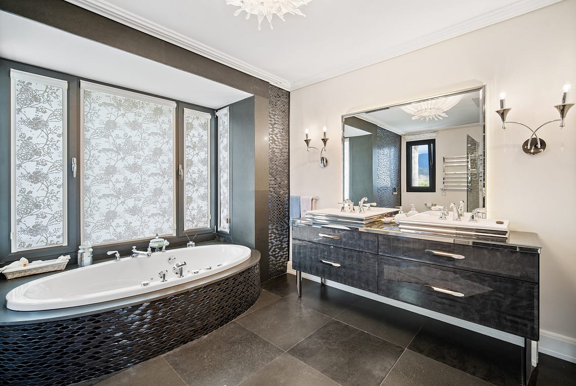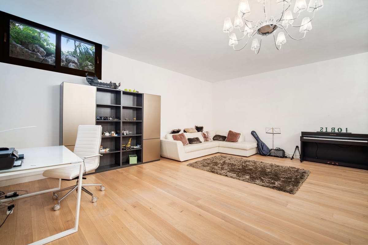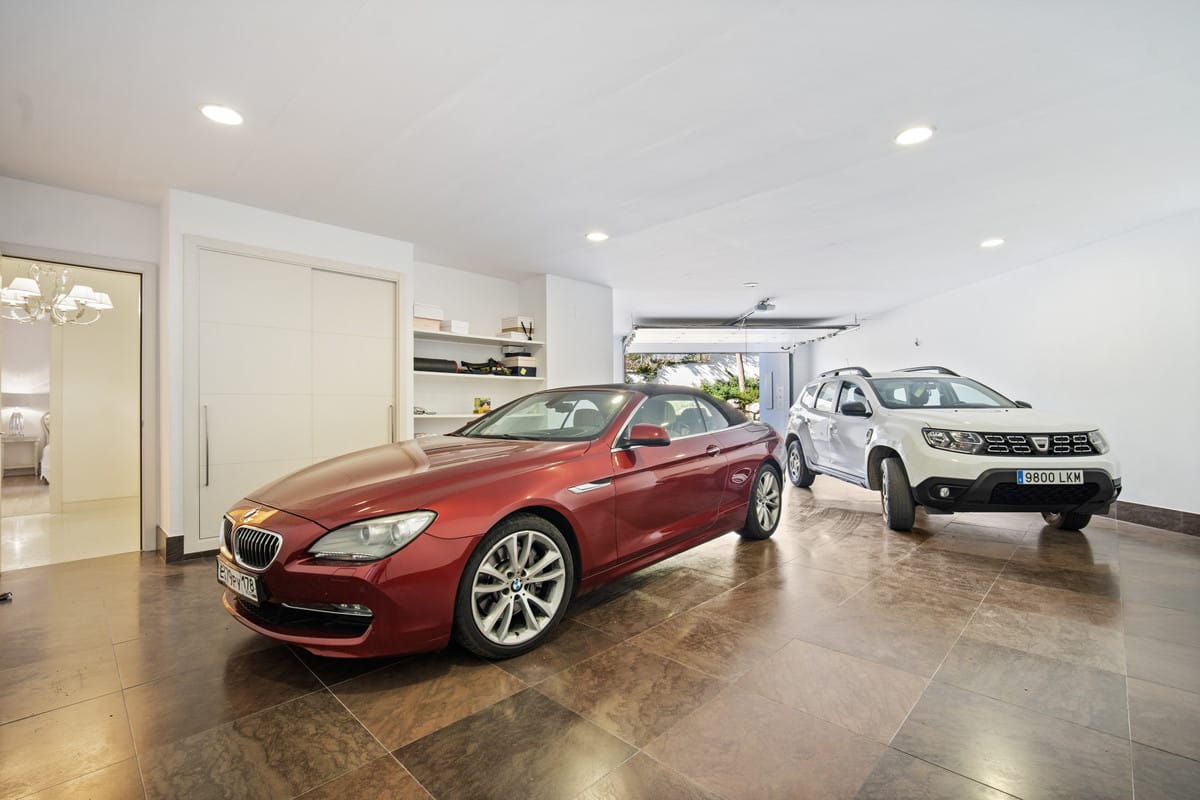 The upper floor has three bedrooms, each with an en-suite bathroom, and a sunny terrace with partial sea views. The basement comprises two additional bedrooms with bathrooms, a games room, a laundry room, a sauna, a hammam, and a garage with enough space for four cars. The house also has its own elevator.
