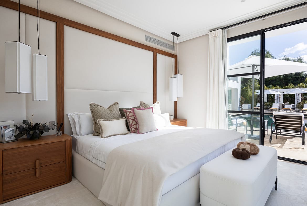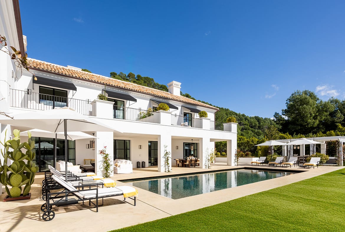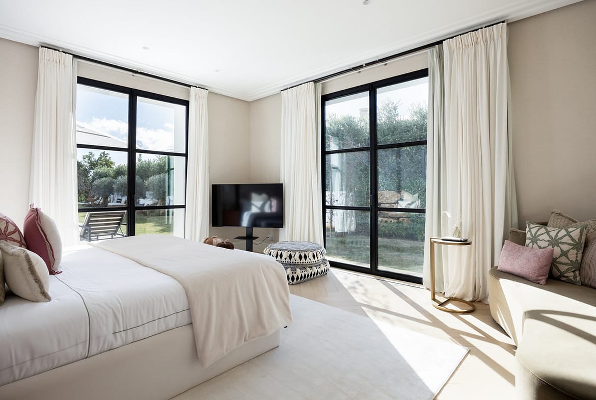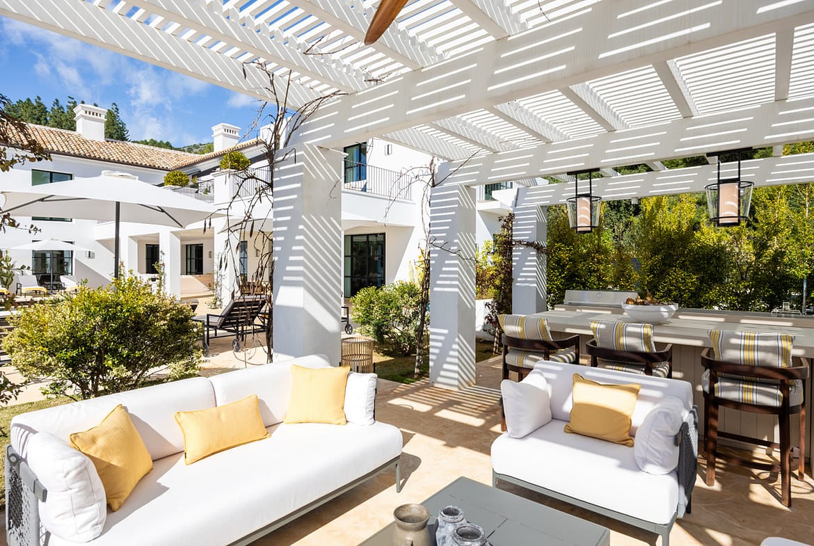 Created by the acclaimed architect behind Finca Cortesín, the villa’s nude-toned exterior radiates serenity and peace, offering a calming atmosphere for its residents. The gardens are a true oasis—perfect for hosting gatherings and making the most of Marbella’s 320 days of sunshine. Colorful floral walls frame the property, adding vibrancy and seamlessly blending the natural surroundings with the estate.