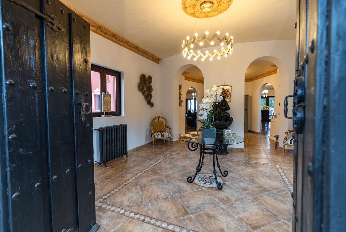 As you enter the gated property you will immediately sense the spaciousness in and around the villa. There is a driveway towards the garage on the left and a carport for about six cars on the right.