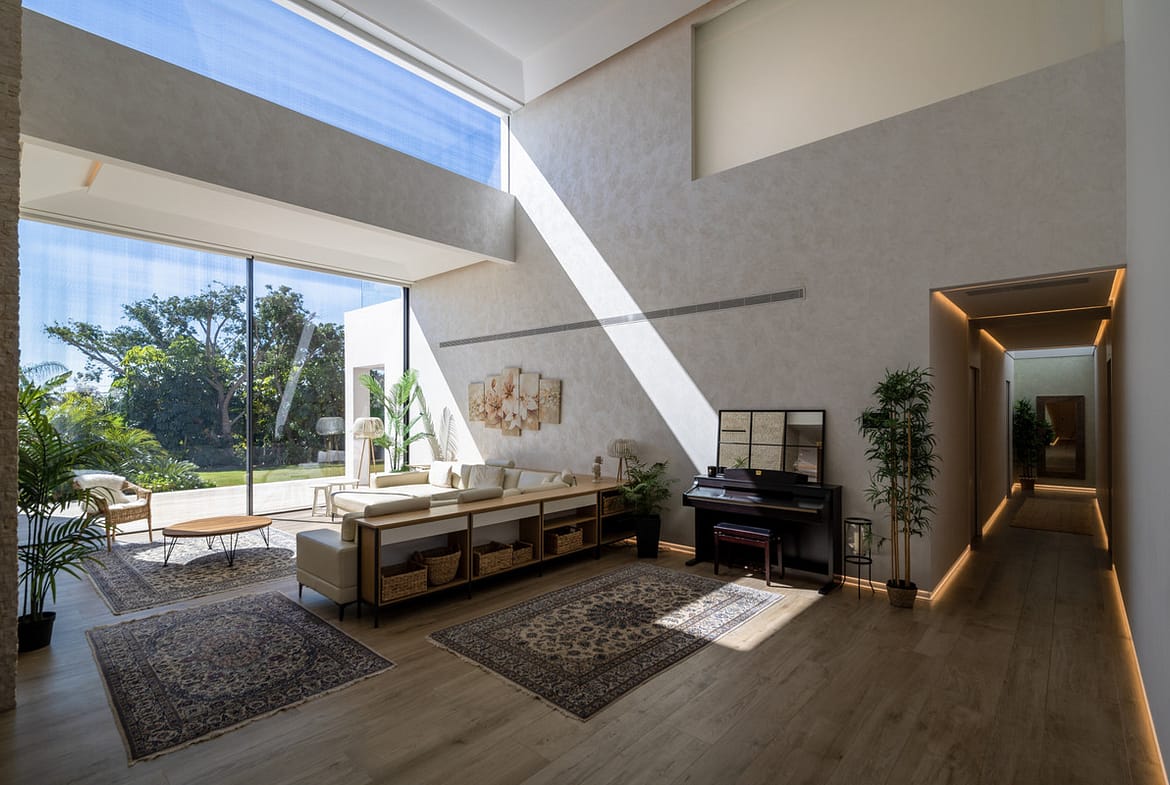 Built with eco-friendly principles, the villa incorporates the latest advancements in home automation, underfloor heating with parquet floors, and sophisticated ceiling designs. Energy-efficient LED lighting and air conditioning systems are seamlessly integrated, and high-speed internet and Wi-Fi connectivity are available throughout the property. Large fitted wardrobes, expansive glass doors, and tasteful design elements add to the home’s functionality and aesthetic appeal.