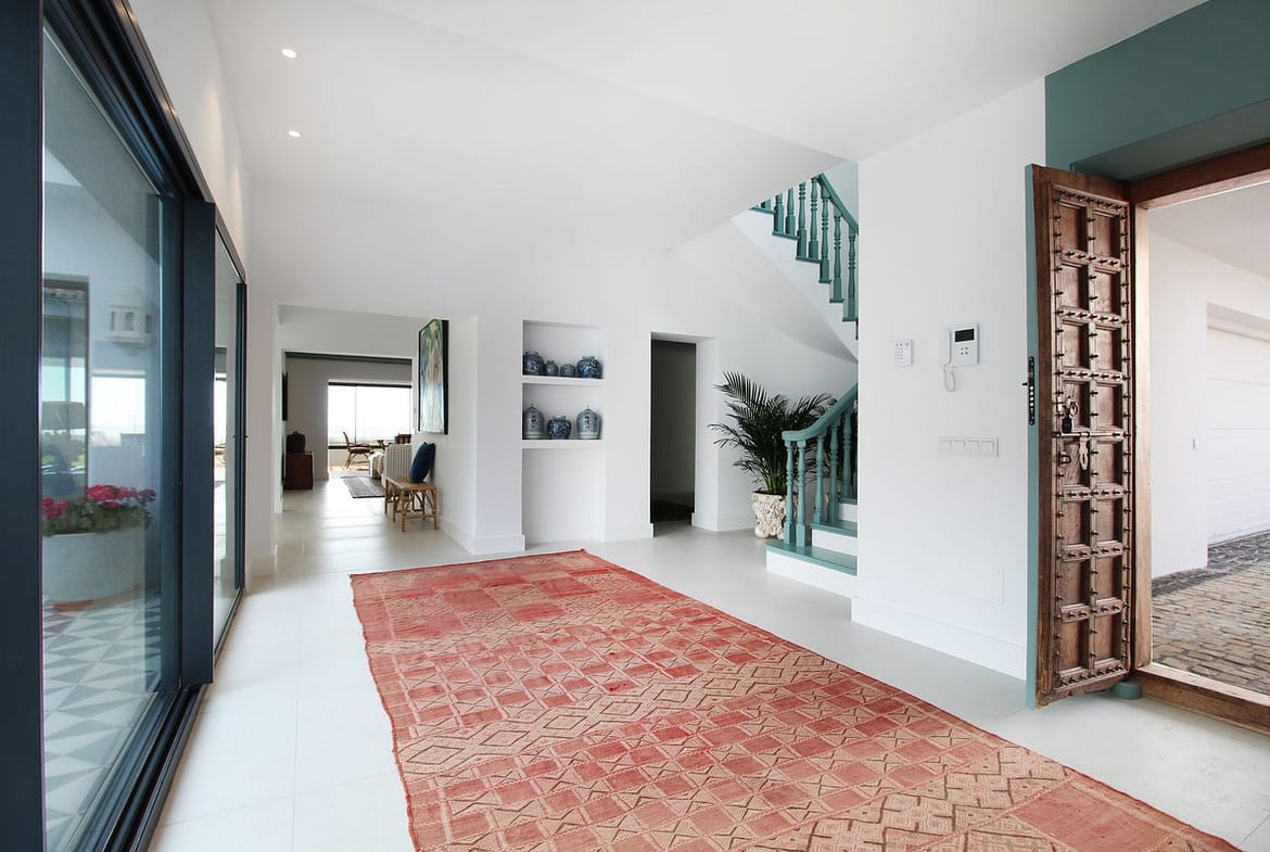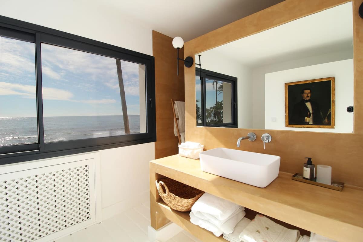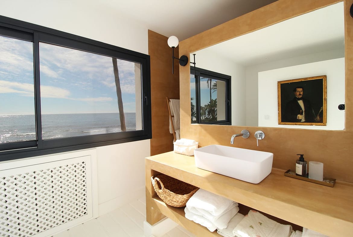 Exceptional villa situated front line beach in the highly desirable and gated community of Casasola, Guadalmina Baja. This recently renovated south-facing property enjoys breathtaking panoramic Mediterranean views with both Africa and Gibraltar in the distance. The property sits on a 2,300m2 plot and is both contemporary and Ibizan in style. The house has a sensible distribution, constructed around two central courtyards that allow light to flow throughout the property. The living room is divided into two separate areas with a cosy sitting room with a fireplace off the main section. This then leads to the dining area that has comfortable seating for at least 10 guests. Both the living and dining areas access the huge covered terrace which in turn leads out to the expansive gardens and pool area. The stunning “L” shaped kitchen has been well thought through and includes Siemens appliances. There is also a separate laundry room off the kitchen. The ground level of the property has six bedrooms suites, two of which have direct access to the gardens and pool area. Furthermore, there are two staff bedrooms at the rear of the property. The upper level consists of the master suite, twin bathrooms, a host of wardrobe space, plus a solarium from which you can enjoy the views and the sound of the waves crashing on the shore. The community has 24h security guards and is located just a short drive from San Pedro and Puerto Banus.