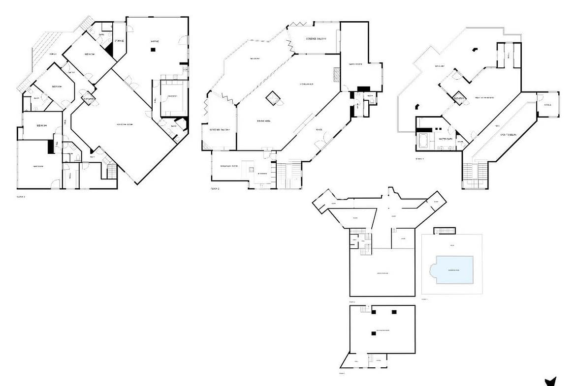 The ground floor includes four additional bedrooms, each with direct access to the landscaped garden and the inviting, heated pool. Adjacent to the pool, a Finnish sauna provides a perfect spot for relaxation. This floor also includes a massive gym with its large mural depicting Lake Inari in Lapland, and a large garage for convenience.