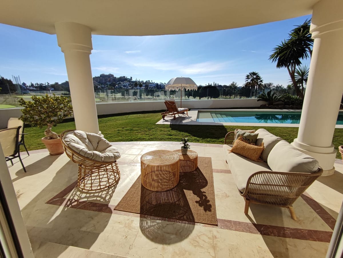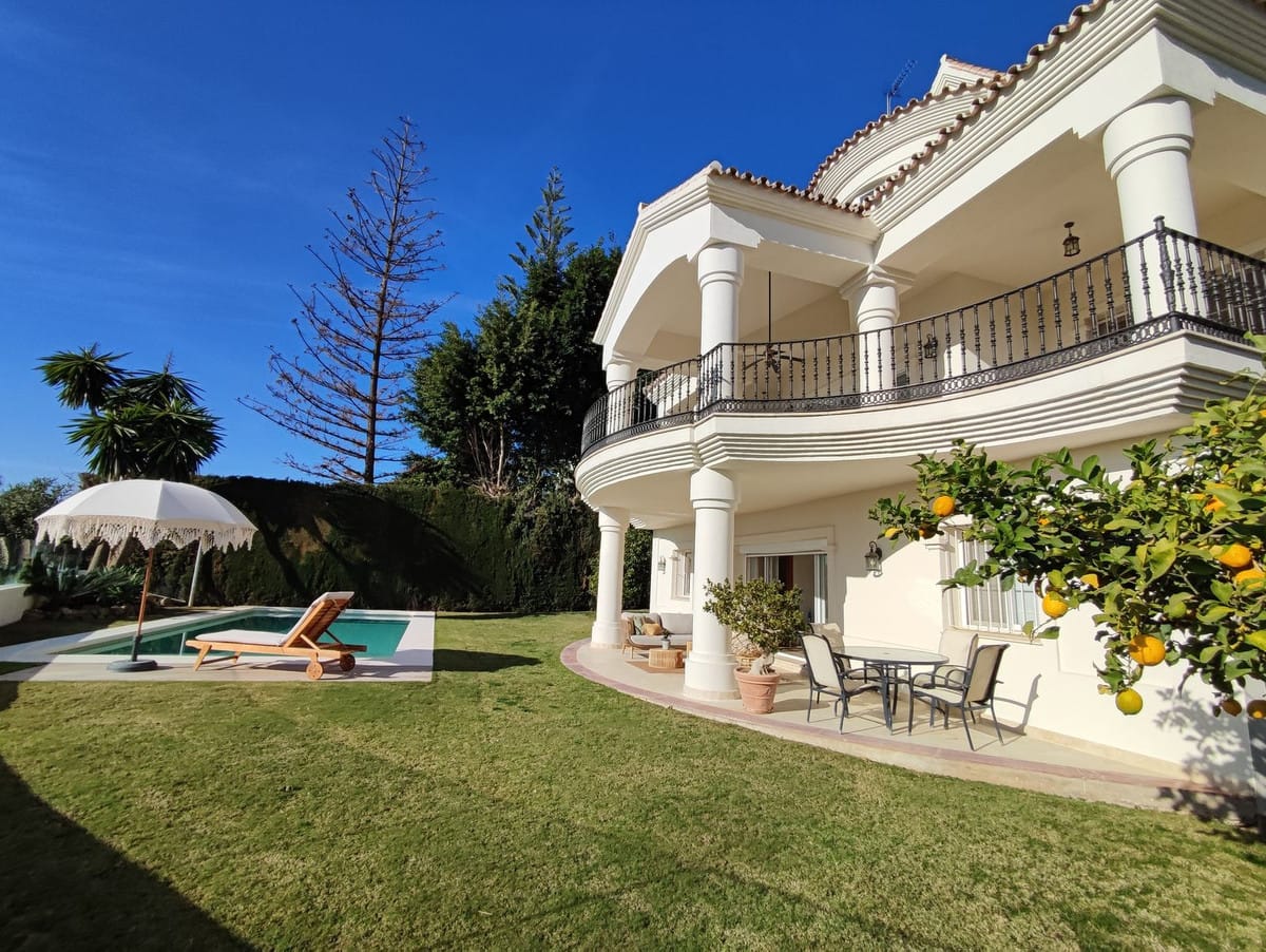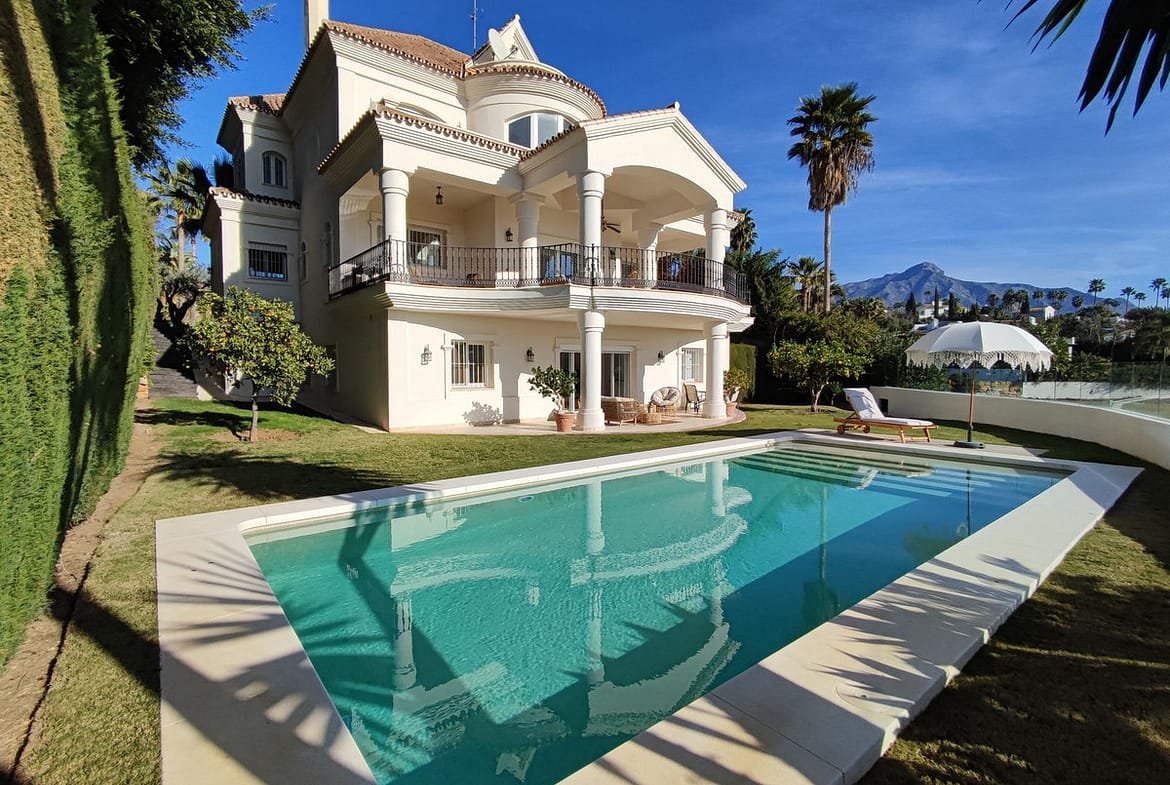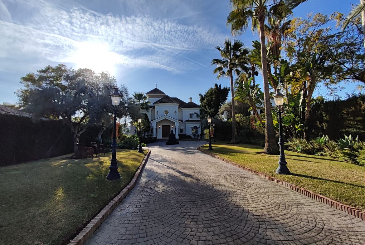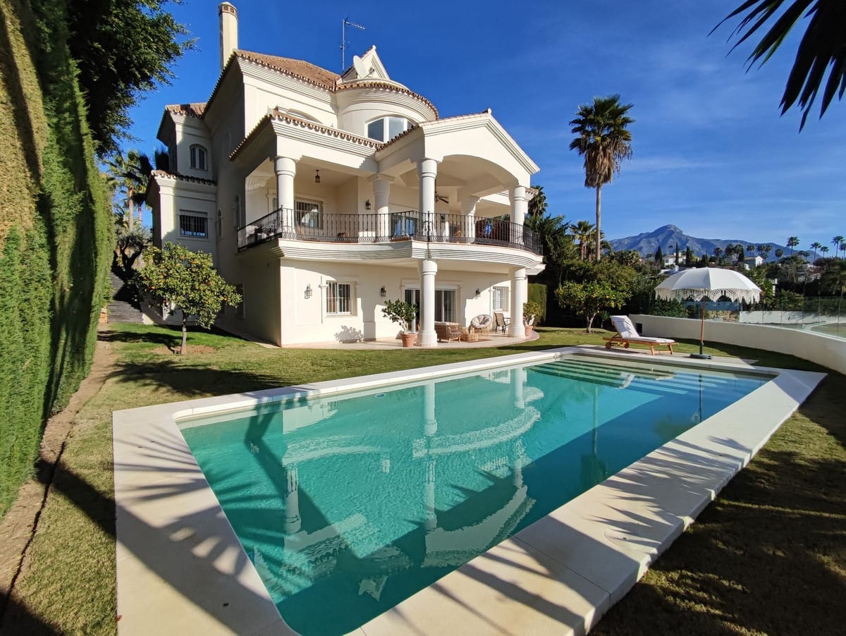 This magnificent villa located in the heart of the prestigious Golf Valley of Nueva Andalucia! This impressive property boasts of an expansive 1.425m2 of plot size and located first line golf. Entering the property, a huge driveway welcomes you to the well-maintained expansive garden area. This recently reformed villa has is divided into 4 floors plus attic, 7 bedrooms, 7 bathrooms, gust toilet, several living rooms and lounge areas, terraces and entertainment area. Upon entering this stunning villa, you will be greeted by a bright hallway with a high ceiling and access to the different areas of the main floor. To the right is a bedroom with ensuite bathroom which could also be an private office.On the left part, you will find a charming independent kitchen fully equipped with high quality appliances. Also, on the main floor you will find the dining area, a separate lounge area and a very chic sitting area with direct access to the terrace. Enjoy the best golf views on the large terrace with different spaces to have your meals or just relax and enjoy the sun and the fantastic views. Going up on the second floor, you will find two grand master bedrooms both with ensuite bathrooms (with bath and shower), both with access to the bright terrace. On the upper floor, you will find a spacious studio which could be used as an office, art studio, another bedroom etc. Going down to the lower floor, you will find, a spacious entertainment room with a cinema, bar, game area; 3 complete bedrooms and 3 bathrooms, a spacious living area-dining room and an open kitchen. We go out to the sunny porch area that leads out to the lush gardens with a beautiful swimming pool. On the lower floor, you will find a very spacious garage for 5-6 cars and a fully equipped gym area. This modern house is equipped with a lift in all floors, individual air-condition hot and cold, fireplace, underfloor heating, alarm system, electric blinds. This classic-style home is built with the best quality materials and modernized elegantly creating a luxurious home in one of the most exclusive areas of Marbella! Surrounded by the best golf courses such as Los Naranjos Golf, Magna Marbella, Las Brisas. Just a few minutes’ drive to the beach and Puerto Banus!