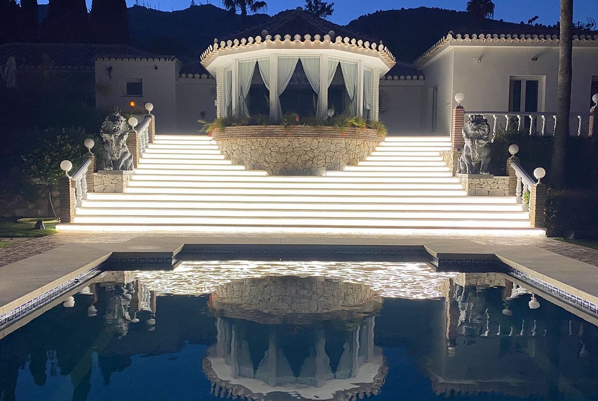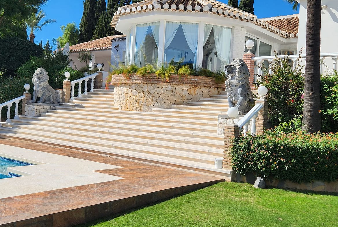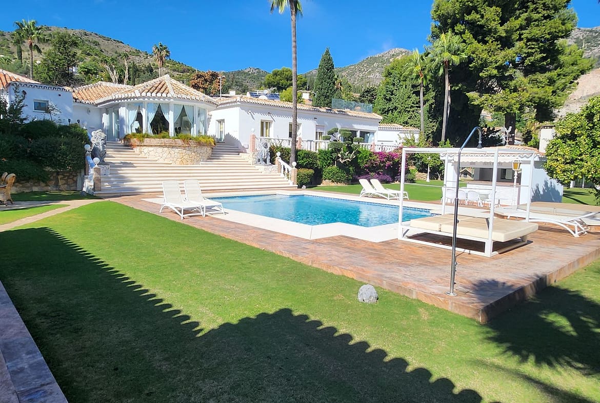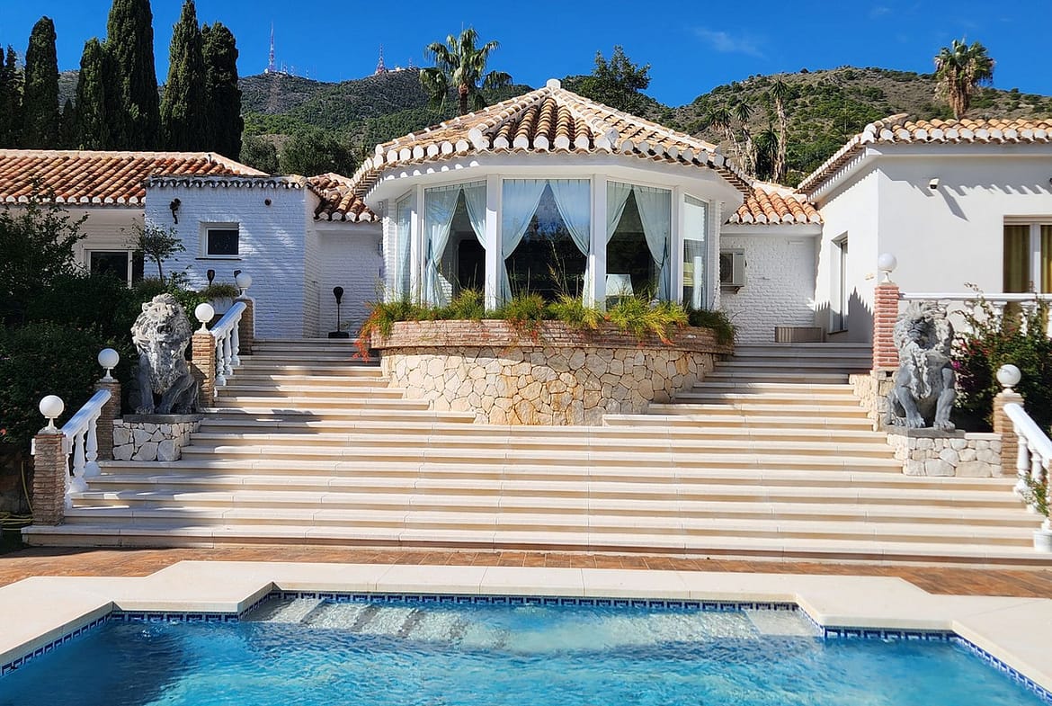 One Level Villa by world-famous architect Frank Lloyd Wright *. Ideal as a family home for her, him and the children. The villa offers an incredible quality of life, plus a range of leisure, hobbies and sports all under one roof. Excellent location in a quiet residential area on a plot of 4500 m² in Rancho Domingo, Benalmadena.