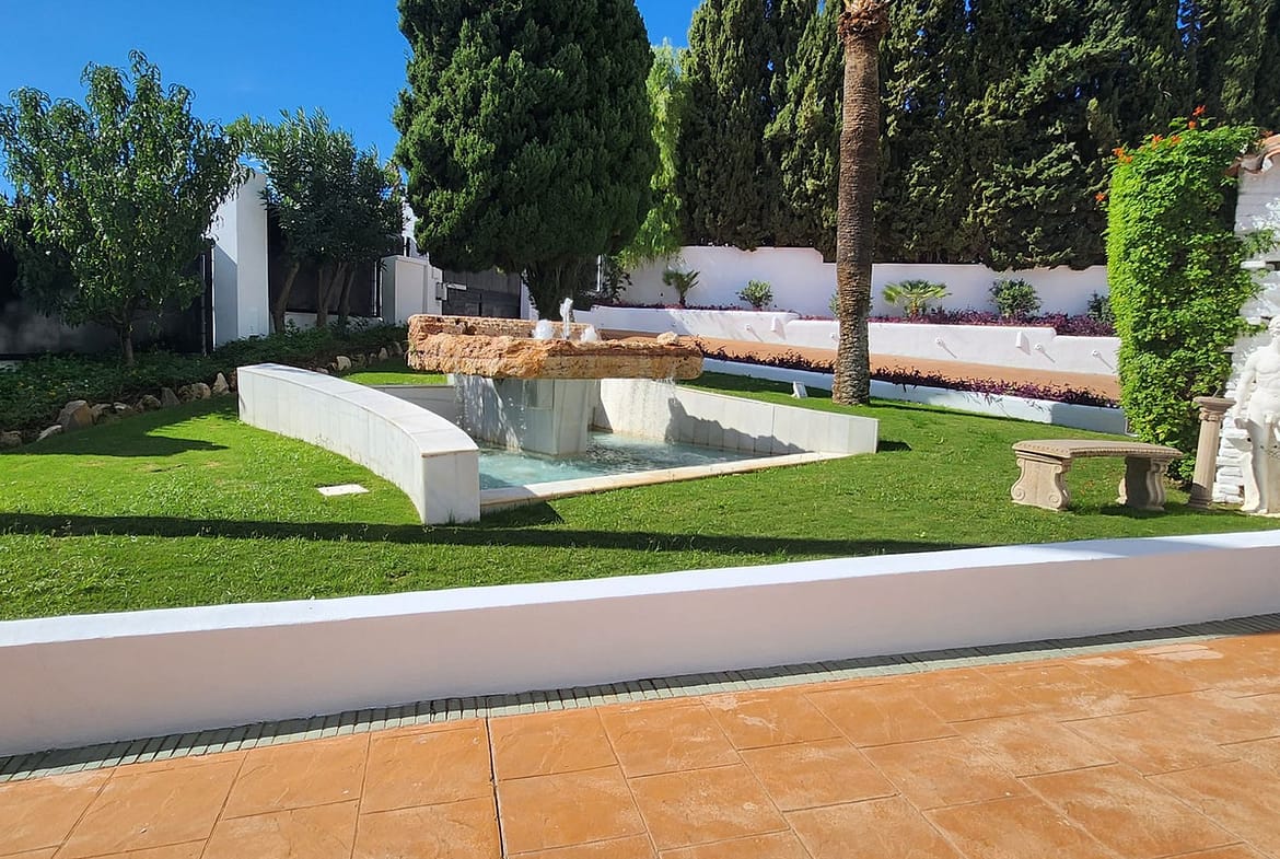 Garden with different relaxing areas with fountains, outdoor salt water pool,barbeque, playgrounds