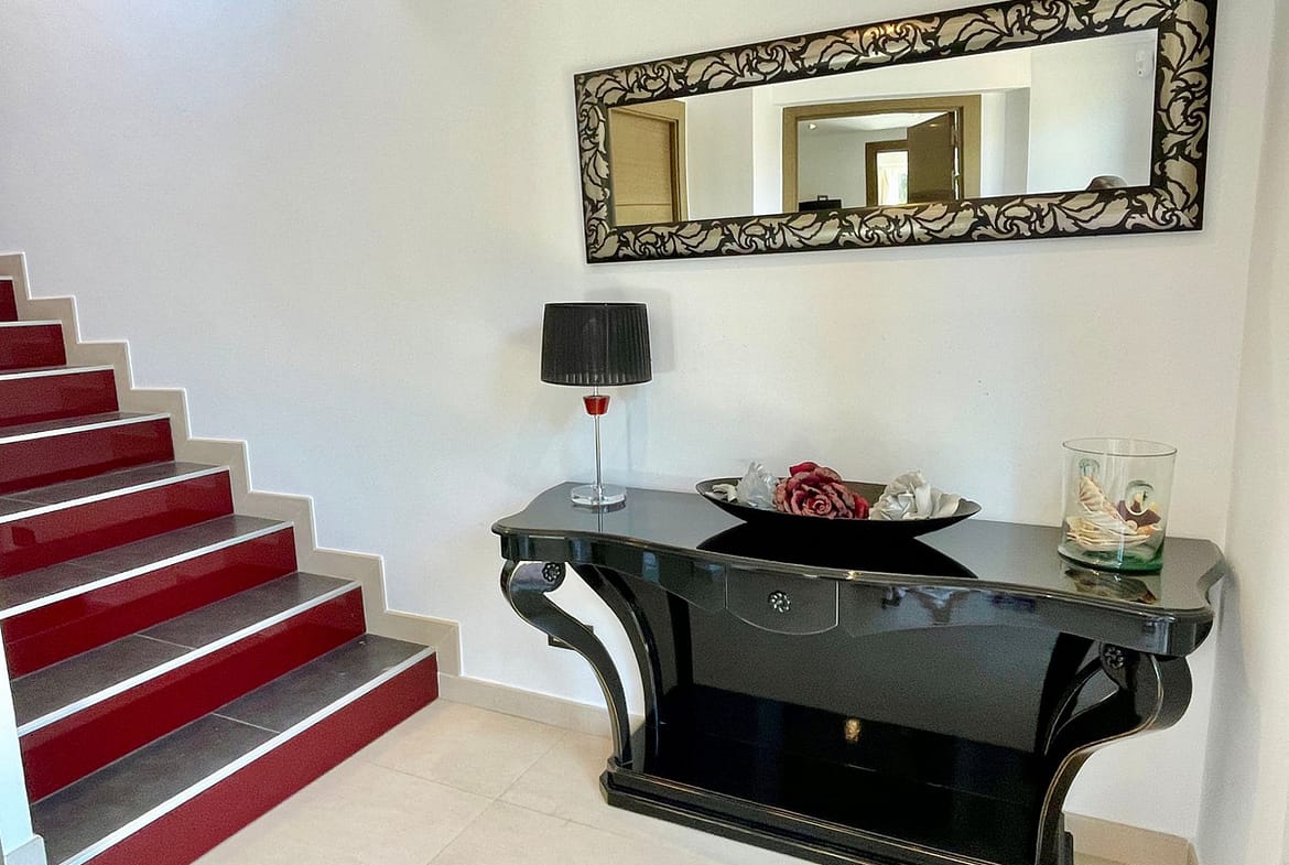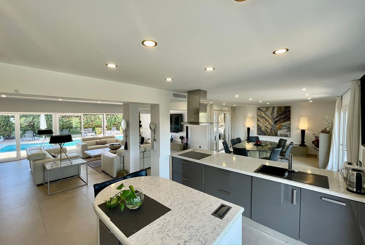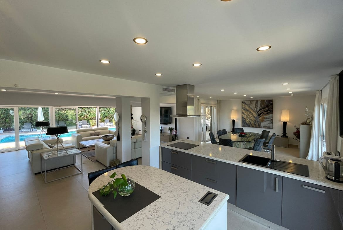 New triple glazed windows with climate glass throughout. Spacious master bedroom with Villeroy and Boch Aveo New generation Bath and China.Large south facing pool with large terraces and lawned garden .Garage for 2 cars , parking for 5 cars .Very private ,totally secure, 500 meters from the beach .